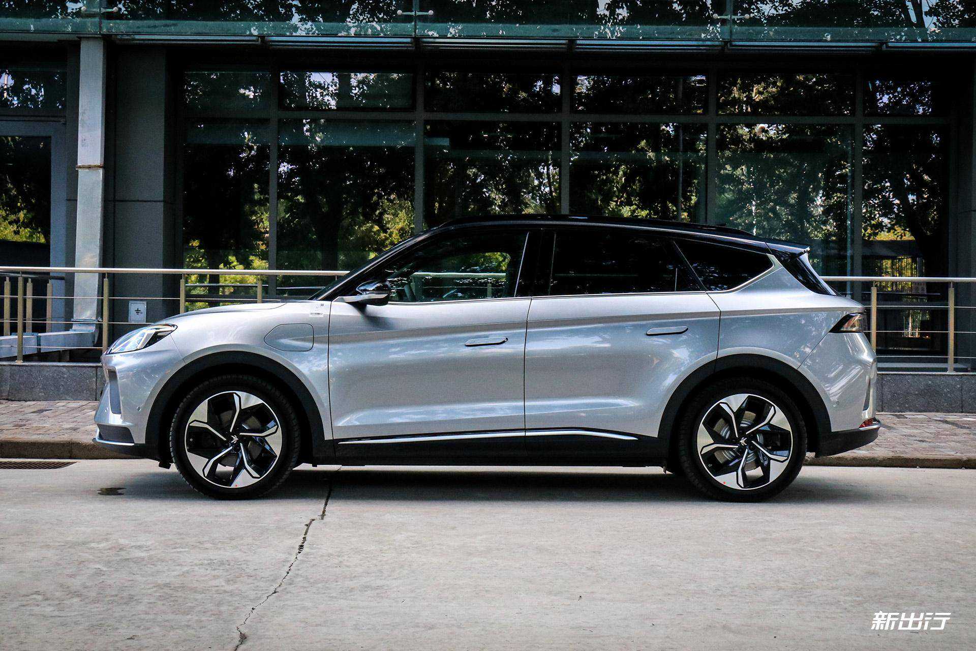 侧面造型方面,实拍车为黑色车顶加灰色车身的双色设计,看起来会更有运动感。同时,车身侧面一体犀利的线条从充电口贯穿至尾部,使整个车身侧面看起来比较有肌肉感,不是臃肿的造型。