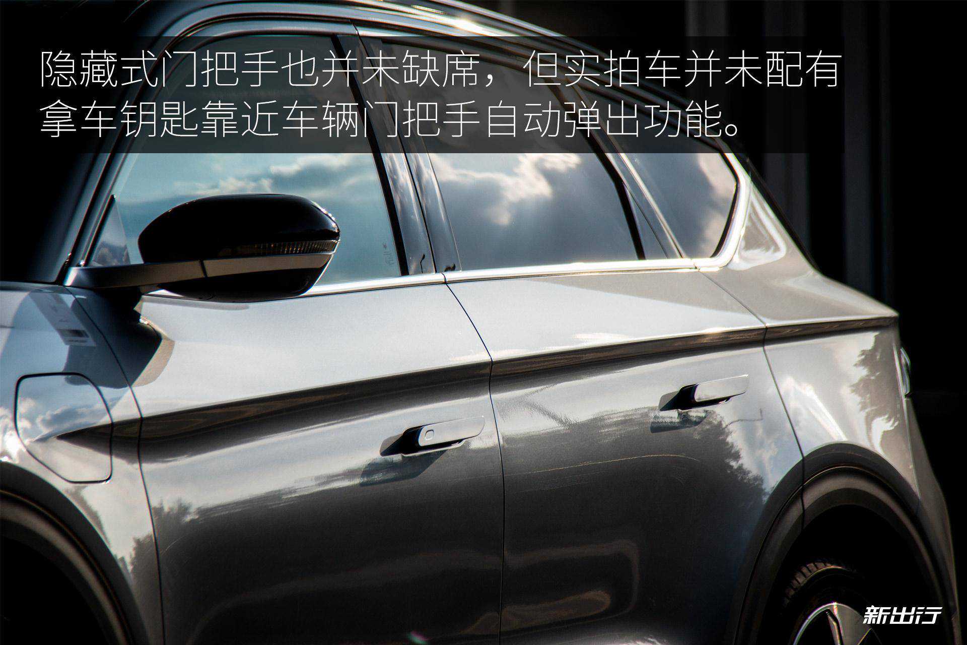 隐藏式门把手也并未缺席,这也是现阶段很多车型都会配有的。同时,实拍车也配有无钥匙进入功能,但实拍车并未配有拿车钥匙靠近车辆隐藏式门把手自动弹出功能。