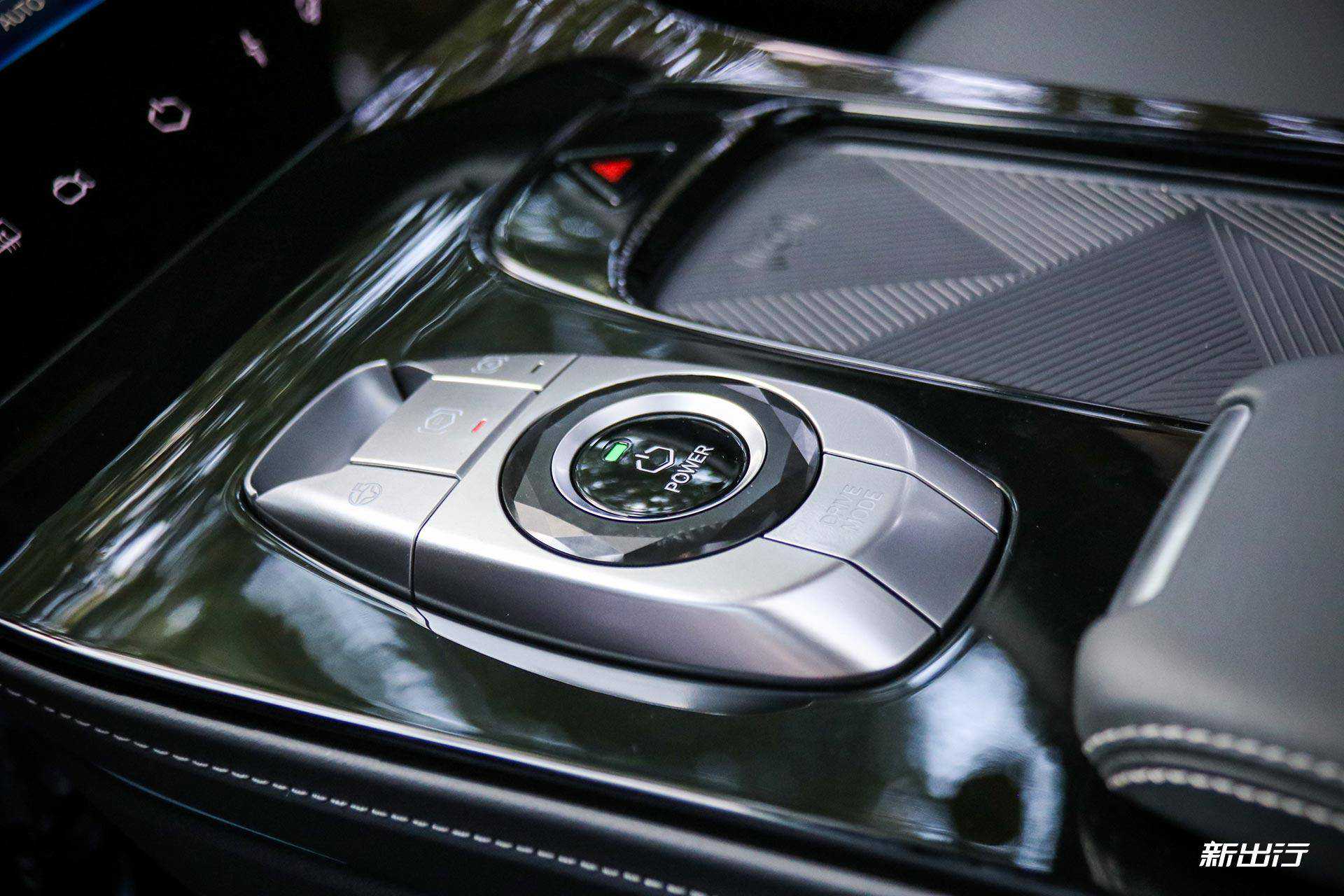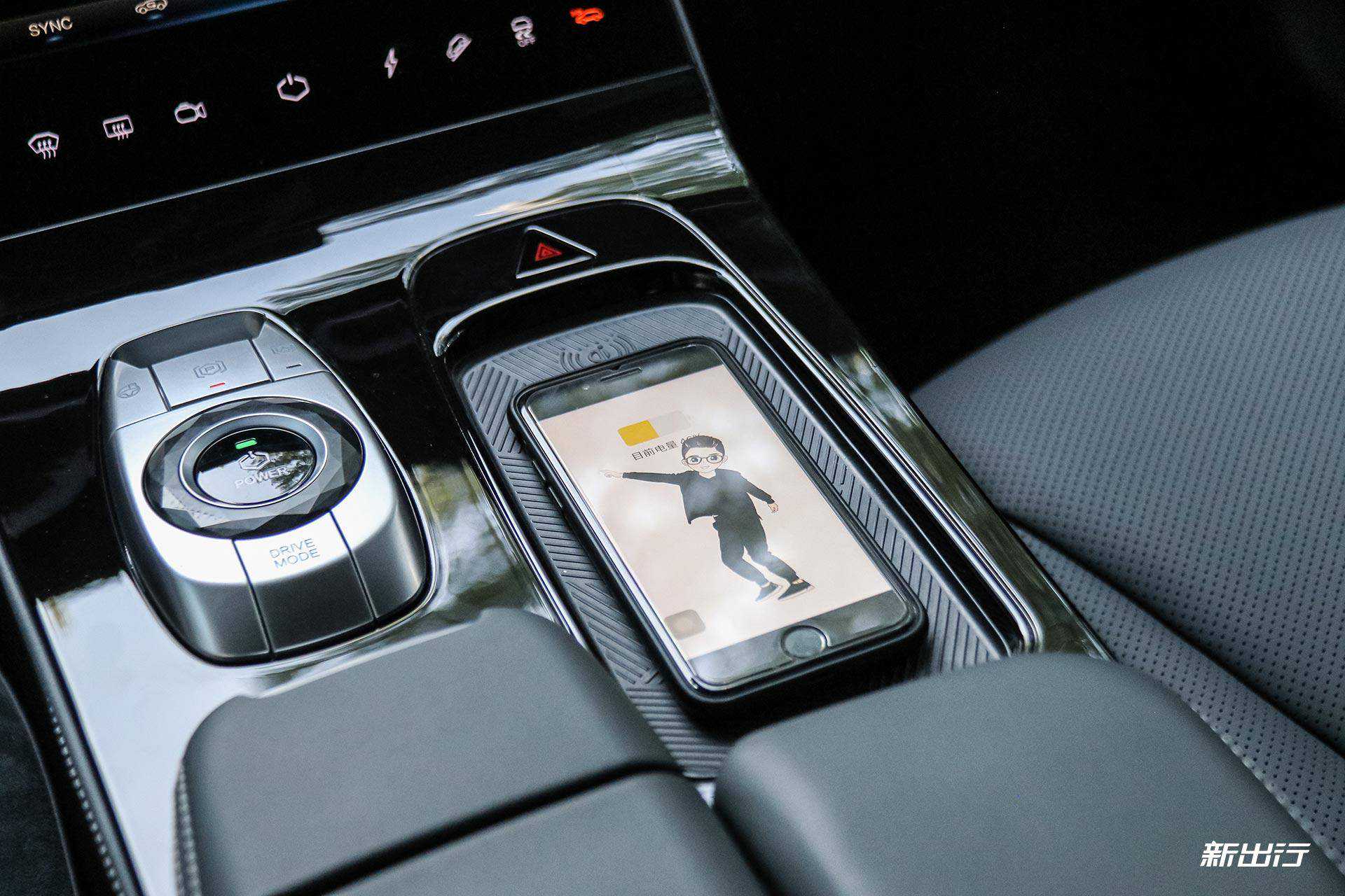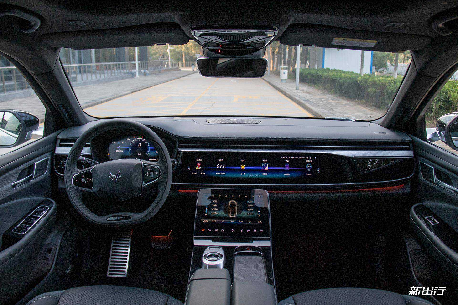 ARCFOXαT采用的是怀挡设计,并且车内保留了启动按键,周围是泊车按键、驾驶模式切换按键以及AutoHold按键,右侧提供了手机无线充电凹槽。后排也提供了独立的空调控制面板,同时也提供了两个USB口,此外还提供了全景天窗。