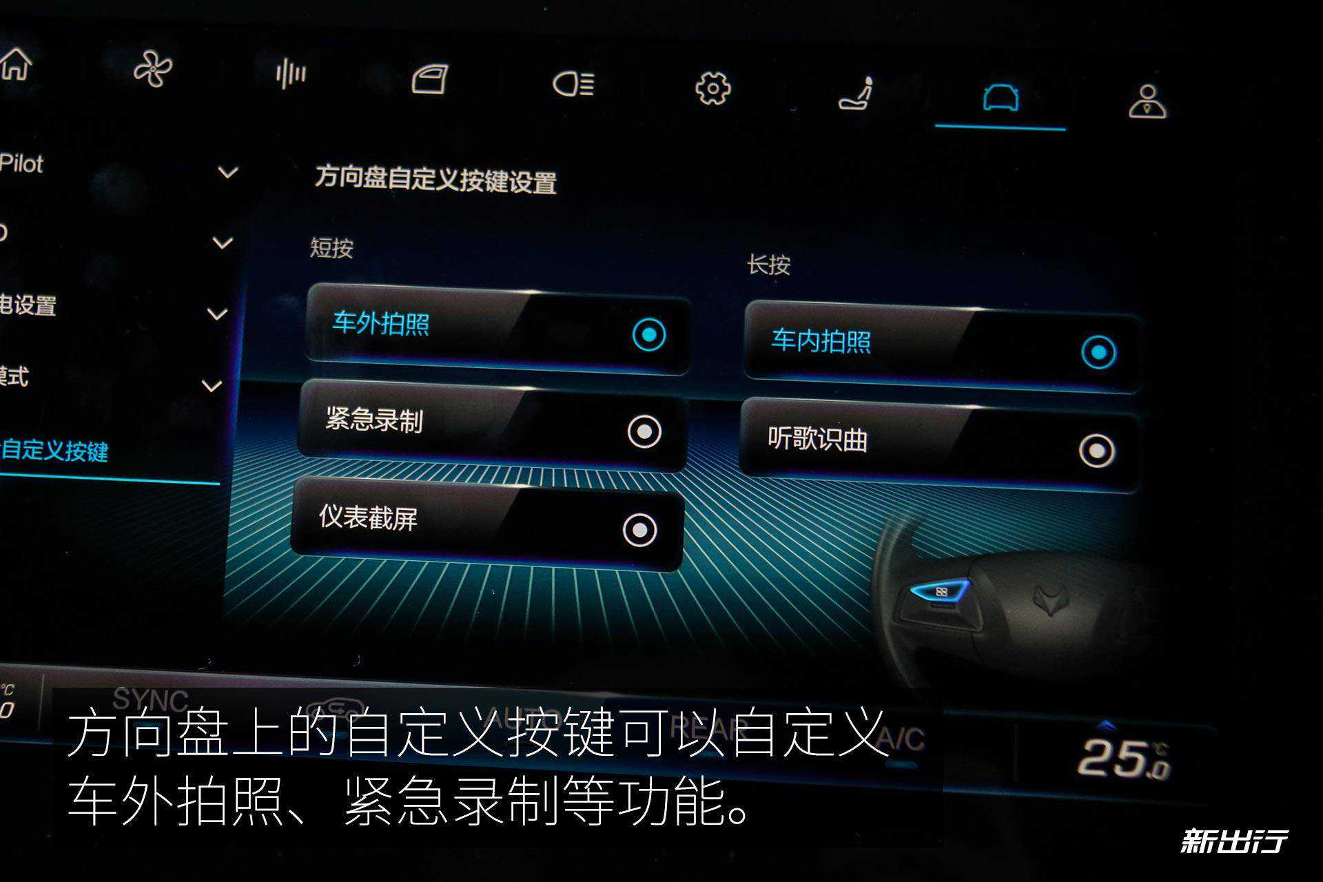 双幅式真皮方向盘握感还是很饱满的,打孔和平底的设计元素增添了一丝运动感。左侧是仪表盘的信息切换按键,右侧则是多媒体以及语音控制按键。此外方向盘左侧还有一颗自定义按键,可以设定车外拍照、车内拍照、紧急录制等功能。
