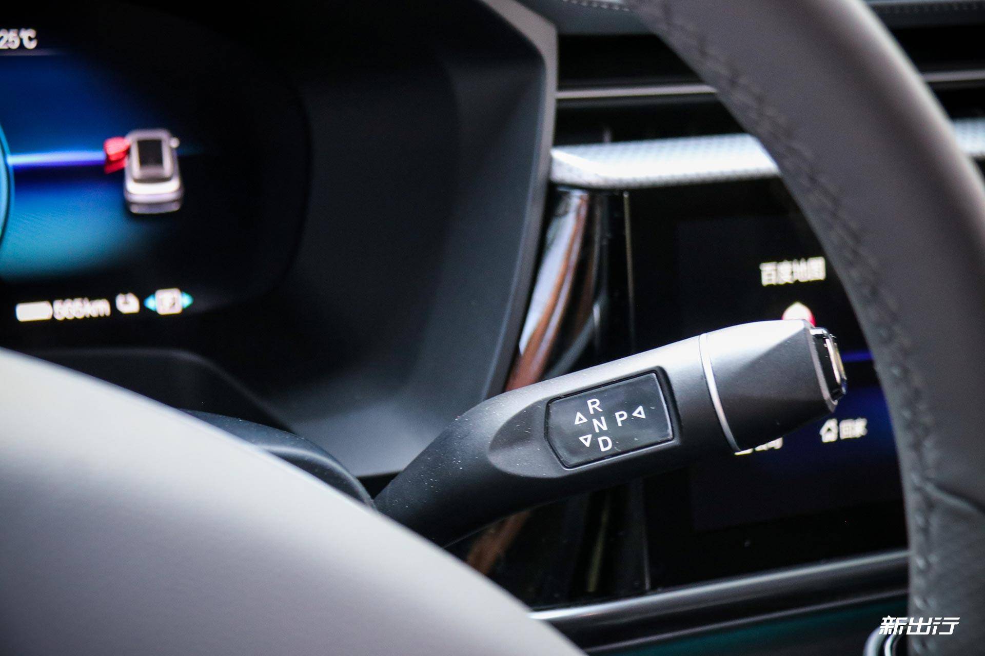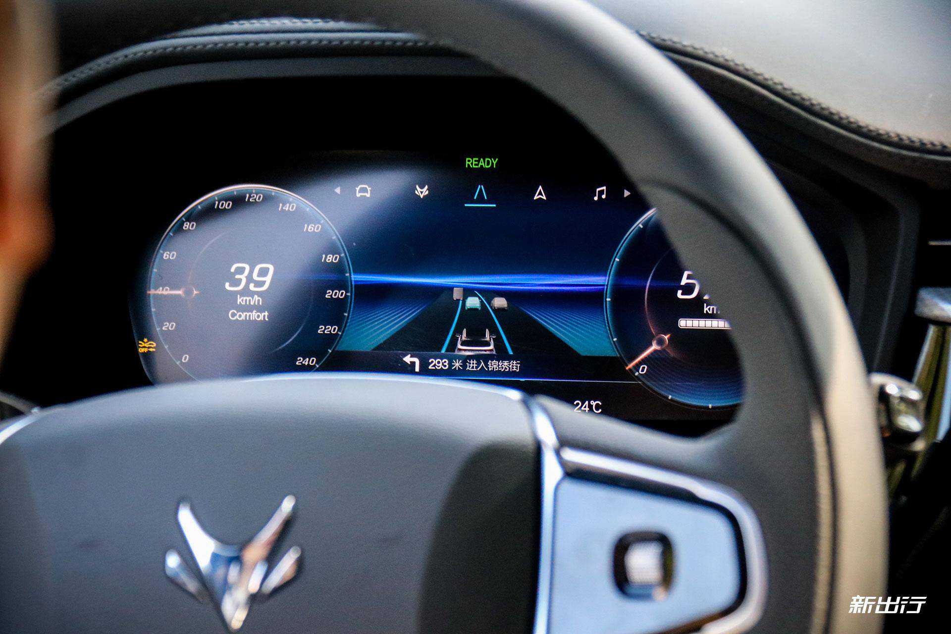 全液晶仪表盘尺寸为12.3英寸,左侧是时速表,右侧是电量和剩余续航。中间是多功能显示区域,可以显示导航、ADAS交互、多媒体等。通过方向盘左侧的切换按键可以切换显示的信息。