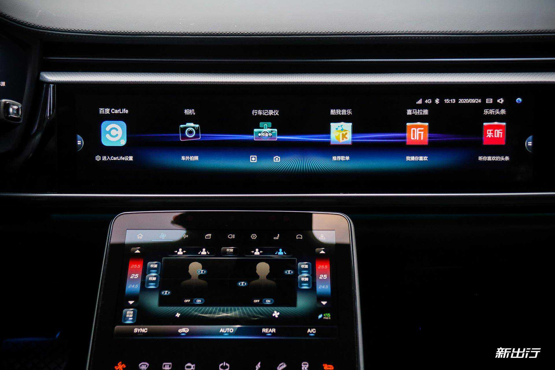 中控横向超宽一体屏尺寸为20.3英寸,官方称这是一块4K屏,具体像素目前尚不清楚。中控屏主要是显示屏,下方的10.2英寸触控屏主要是用于车辆设置和空调调节等。