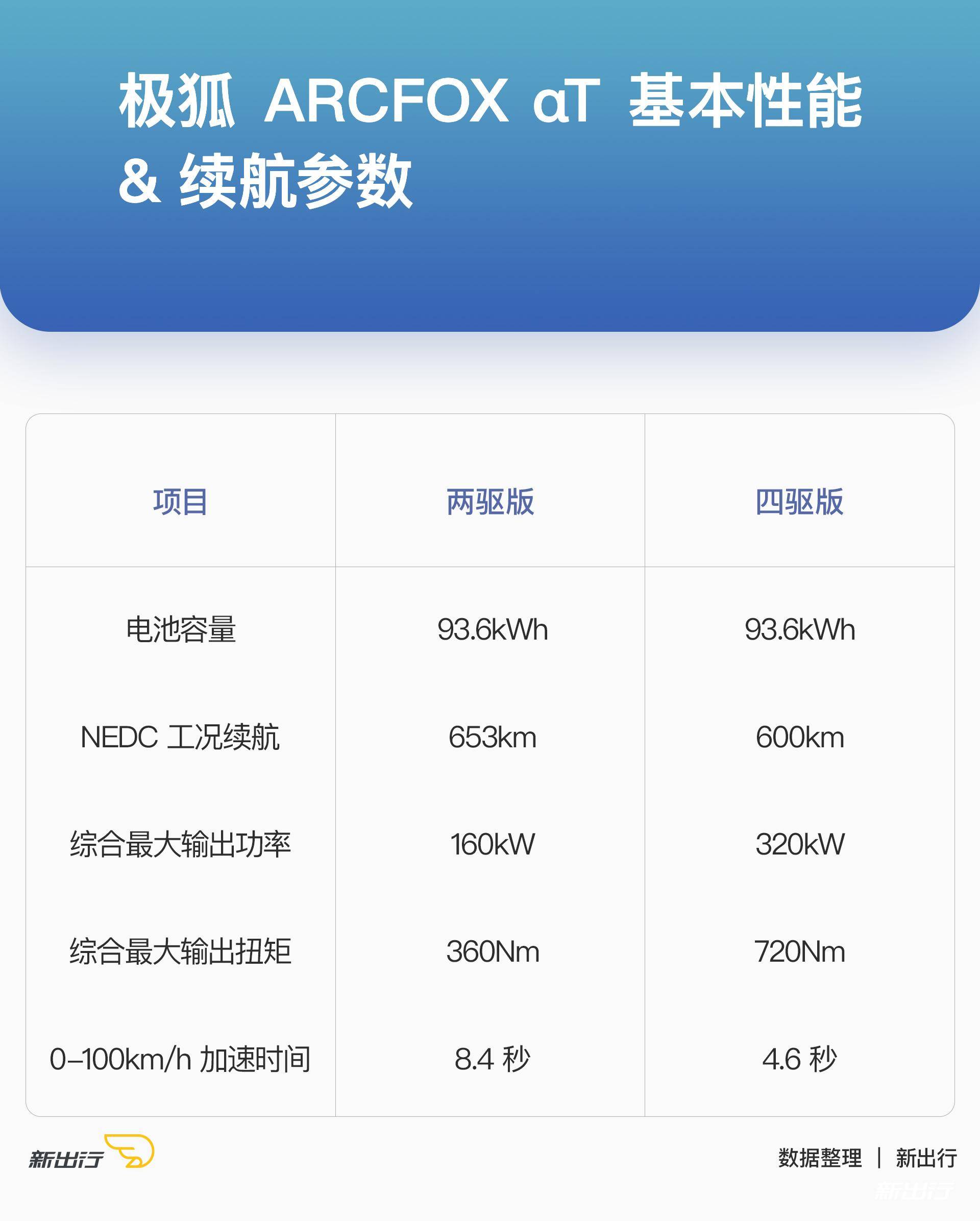 在电池续航参数方面,ARCFOXαT搭载的是来自SK的高能量密度电池,电池容量为93.6kWh,两驱版NEDC综合续航为653km,四驱版NEDC综合续航为600km。
