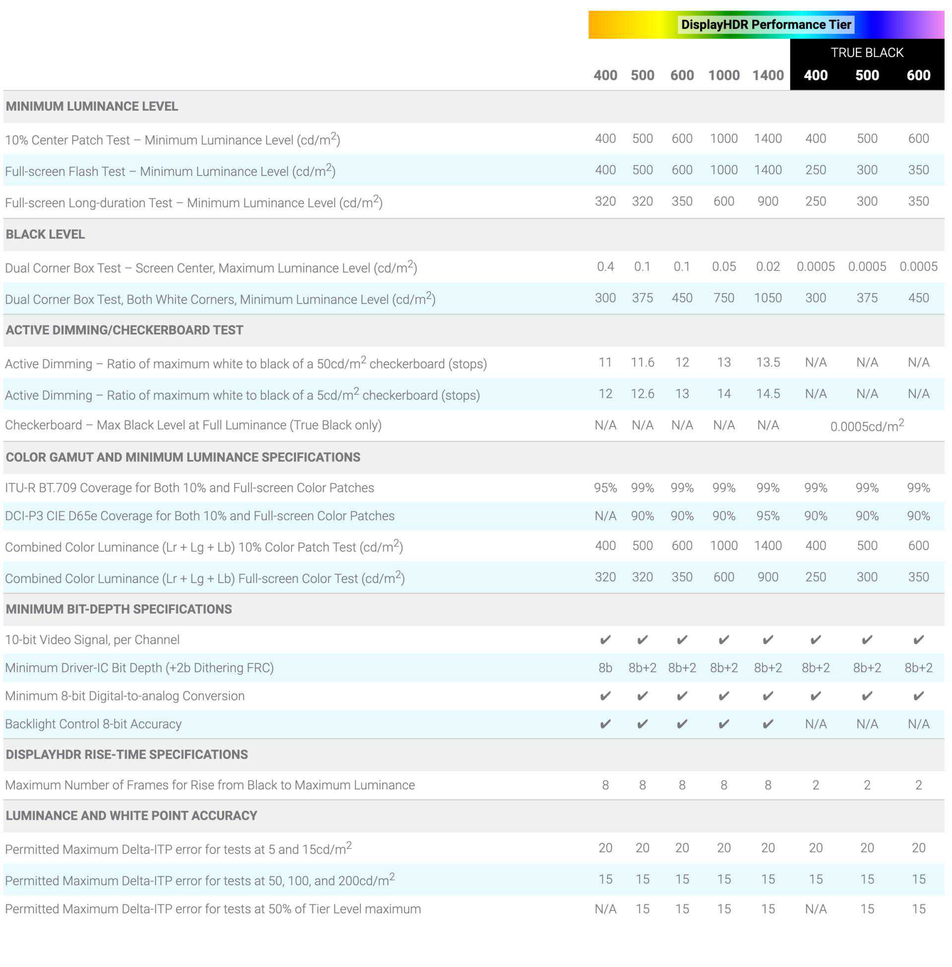 ▼不同HDR认证详细差异对比,VESA详细规定了亮度等级(包含不同的测试条件)、黑态等级(同时要求黑态与亮态)、棋盘测试、色域(同时对广色域下亮度有具体的要求)和最小亮度、最小色深、上升时间(Frame/帧数)、亮度和白点精度