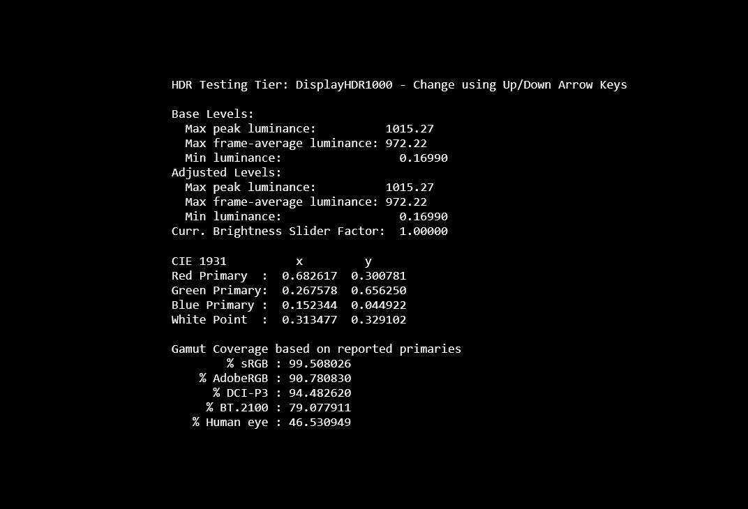 P27A6V采用了1152分区背光,测试的主要参数都达到了VESADisplayHDR1000规格,开启HDR后色深自动调整为10bit,系统内也可以正常抓取到DisplayHDR1000Tier(但从官网看没有送测认证,抓取Log信息符合HDR1000Tier,推测应该可能是成本原因)。PQ模式下最大有效亮度970nits,最大全屏亮度929nits,最小有效亮度0.1979nits,全屏亮度表现不错。DisplayHDR下,峰值亮度1015nits,最大全屏亮度972nits,最小有效亮度0.1699nits。