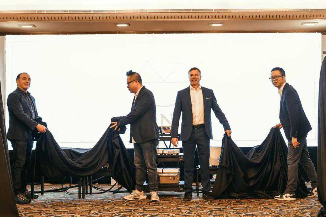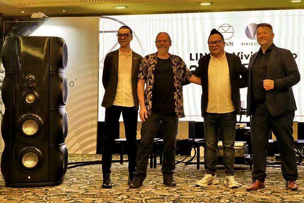 VividAudio总设计师LaurenceDickie和泽森品牌经理龙兴源、VividAudio全球销售总监EwaldVerkerk和泽森音响总经理吴佳雄为VividAudioMOYAM1拉开帷幕。