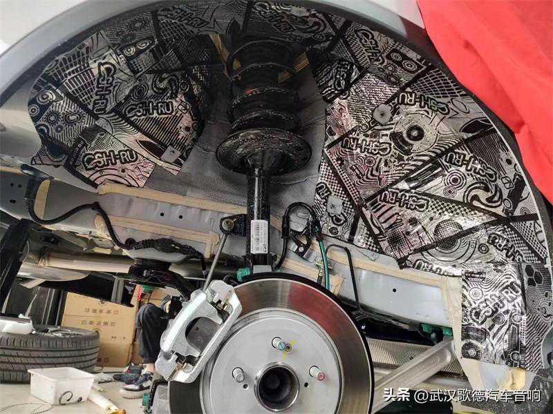 想要好的声音,良好的隔音必不可少。比亚迪唐的主要噪音来自于胎噪,因此我们将STPCSH小炸弹和航空AC06棉均匀的贴满在四个翼子板上,止振加吸音的双层搭配,来有效的降低车内的胎噪声。
