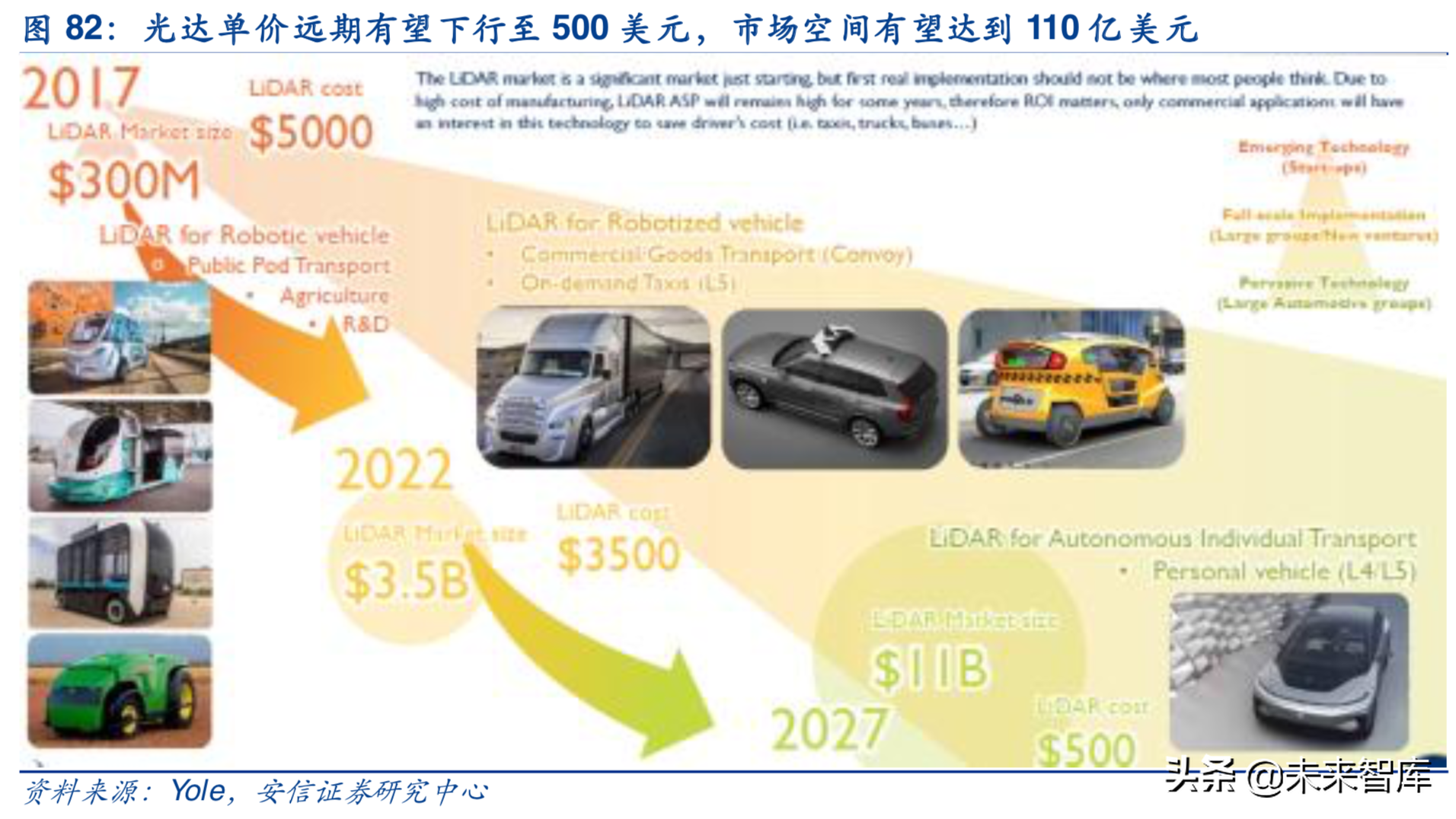 在过去两年中,已有超过8亿美元投资于LiDAR初创公司。例如,Blackmore成立于2016年,从宝马和丰田获得了1800万美元的投资。成立于2012年的Quanergy在2017年获得1.8亿美元投资。虽然LiDAR目前技术的不够完善和成熟,但是初创企业、工业企业、Tier1厂商和汽车厂商都纷纷投资于不同的LiDAR公司,谁也不想错过下一个百亿美金市场。Yole测算2017年光达单价为5000美元,预计到2022年光达单价下降到3500美元,到2027年下降到500美元,拉动市场广泛应用,市场空间将突破110亿美元。