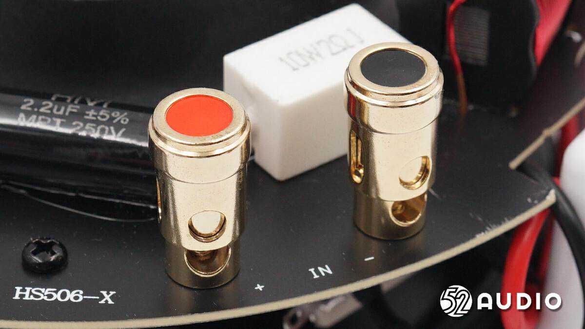 用于连接到副扬声器的正负极导线,设计有标识,便于安装时区分。