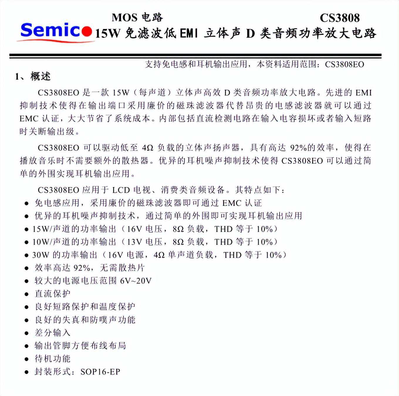 SEMICO华润矽科CS380815W免滤波低EMI立体声D类音频功率放大器,可以驱动低至4Ω负载的立体声扬声器,具有高达92%的效率,使得在播放音乐时不需要额外的散热器。优异的耳机噪声抑制技术使得CS3808EO可以通过简单的外围实现耳机输出应用。