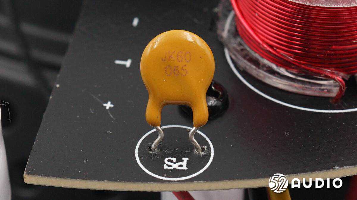 丝印JK60的自恢复保险丝特写,用于功放输出直流以及过载情况下的扬声器保护。