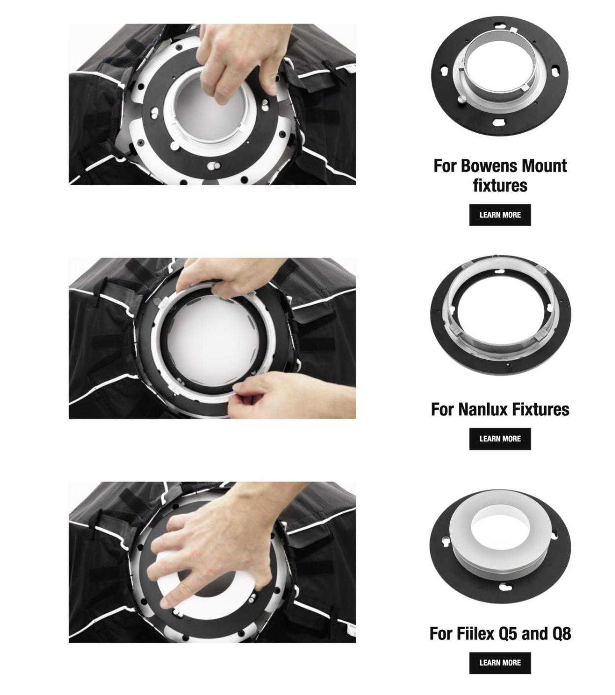 我非常喜欢DoPchoice这套“兔耳”接口,利用它能够在爱图仕、Fiilex、南光、Prolycht等品牌的COB灯头上使用DoPchoice的变光附件,比如八角形SNAPBAG、矩形柔光箱或柔光罩等。