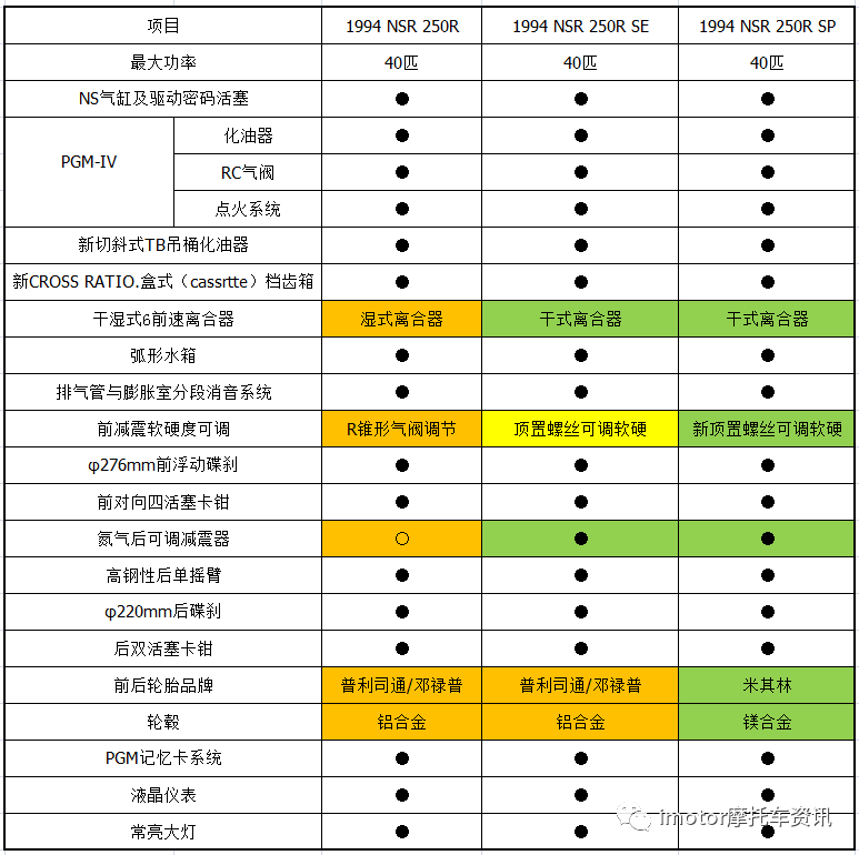 首先来个1994年版本NSR205R-PGMⅣ硬核参数对照表。实际上1994年的NSR-PGMⅣ在发动机与电控设备部分是完全一致的,制动方面都是配备日清的对向四活塞卡钳,制动性能可以说是绝对够用。不同在于减震器与轮胎轮毂,有什么不同?参数表,各位自行对比!