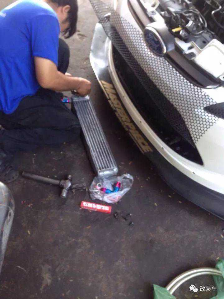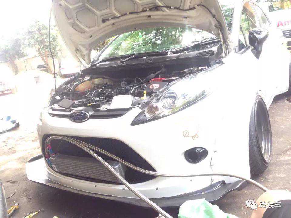 俗话说"改装无止境,一味得过整",在下一阶段,不知道是不是因为前杠内的空间不足,亦或者说是想凸显自己的个性,这位泰国小哥决定将油冷(这款嘉年华是自吸车型)直接挂在前格栅上面了。但再过了不久之后,除了左车灯开了一个口用于进气外,车主更是将油冷的管路直接接到车灯处,先不说用处大不大,但至少外观上绝对是这条街最靓的仔!