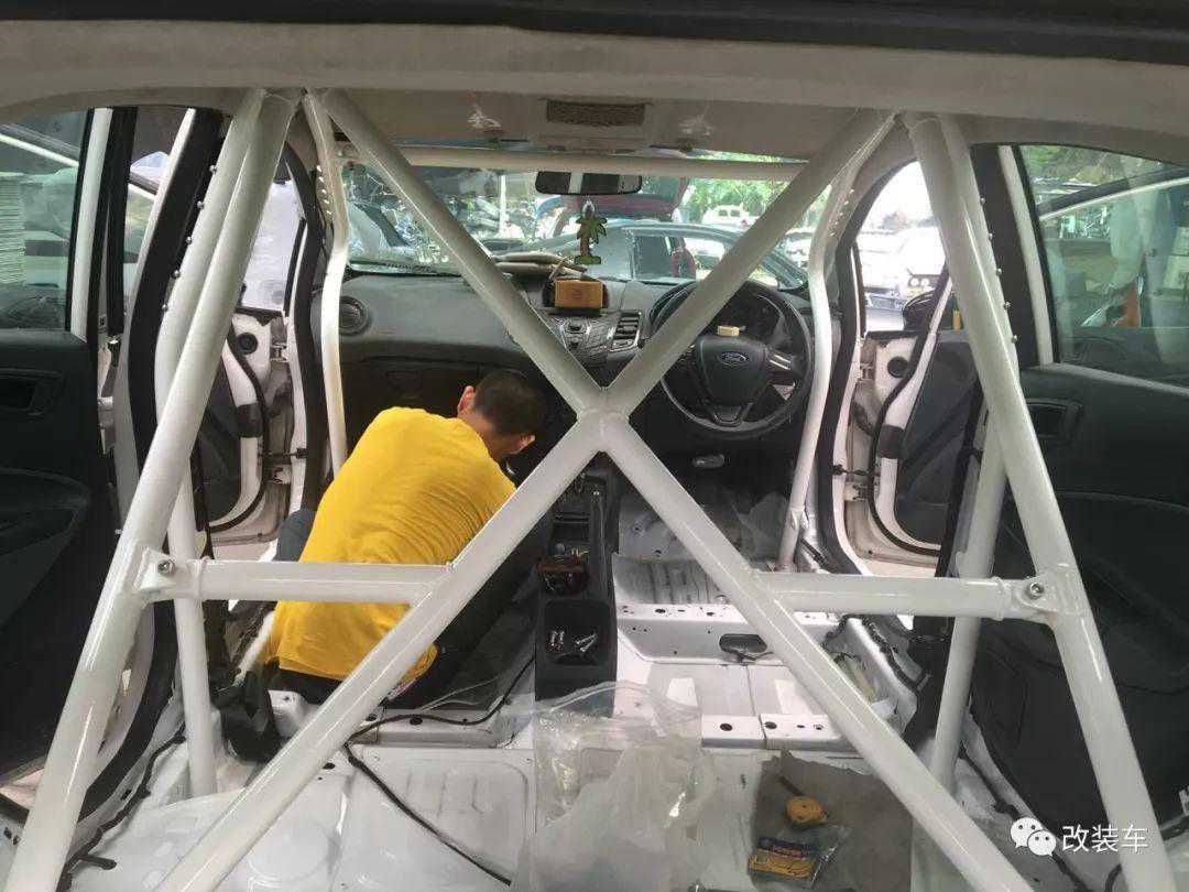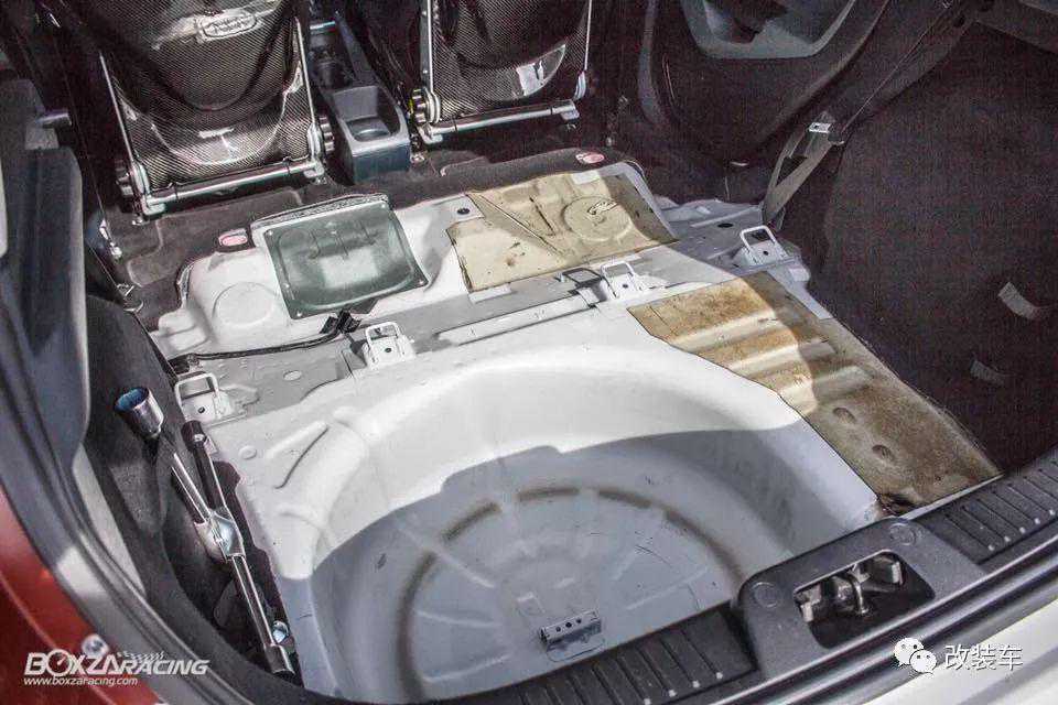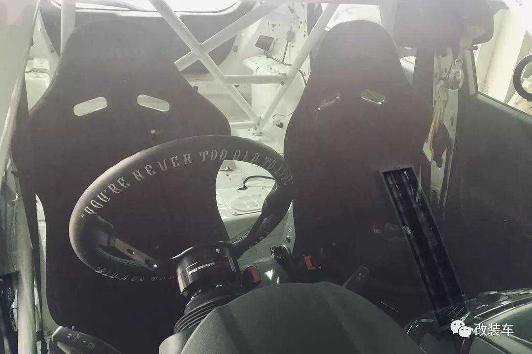不仅如此,除了越来越竞技的外观,内饰更是采用了极致的偷轻。只保留了前排座椅,整个后排全部拆空,前排底板更是直接采用了防滑的铁皮板,加上白色的防滚架……你可要知道,这绝对是平时只能在赛车上面看到的内饰。