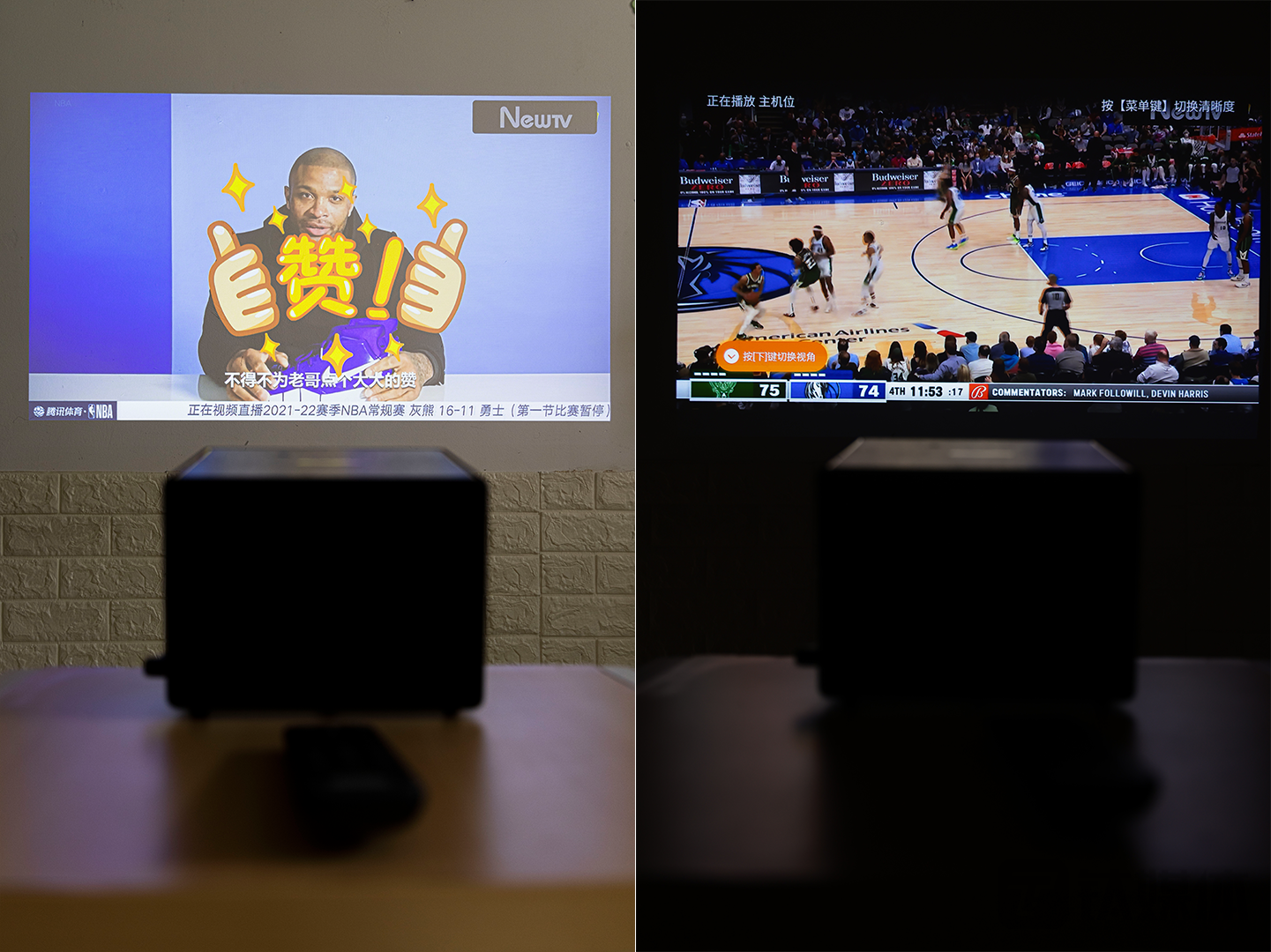 因此,在实际使用中,即使在有外部光源的环境下,EF-12投影在白墙上的显示效果也非常不错。作为对比,这里钛媒体App在同样的曝光参数下拍摄了两张实际显示效果的图片,提供给各位读者作为参考。