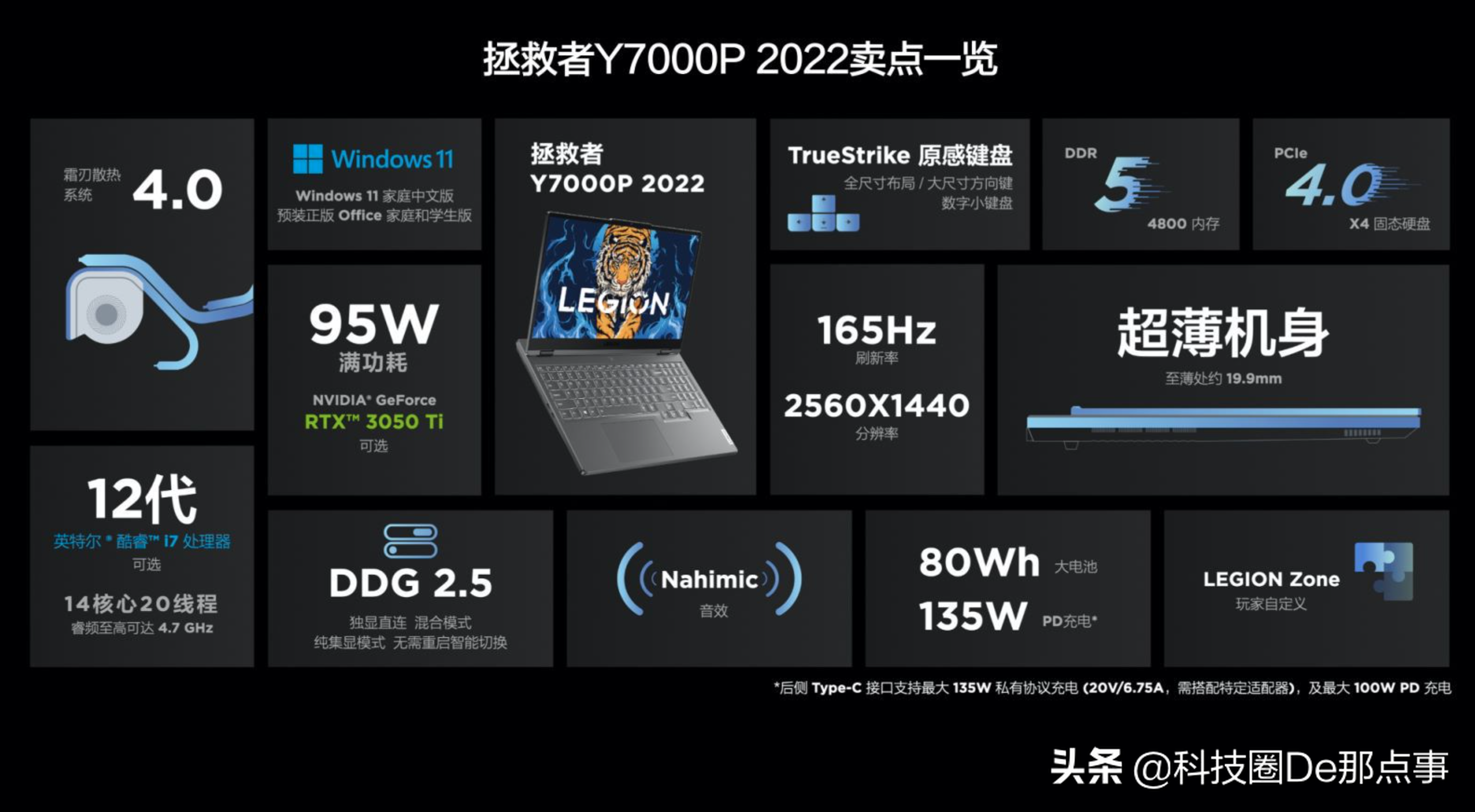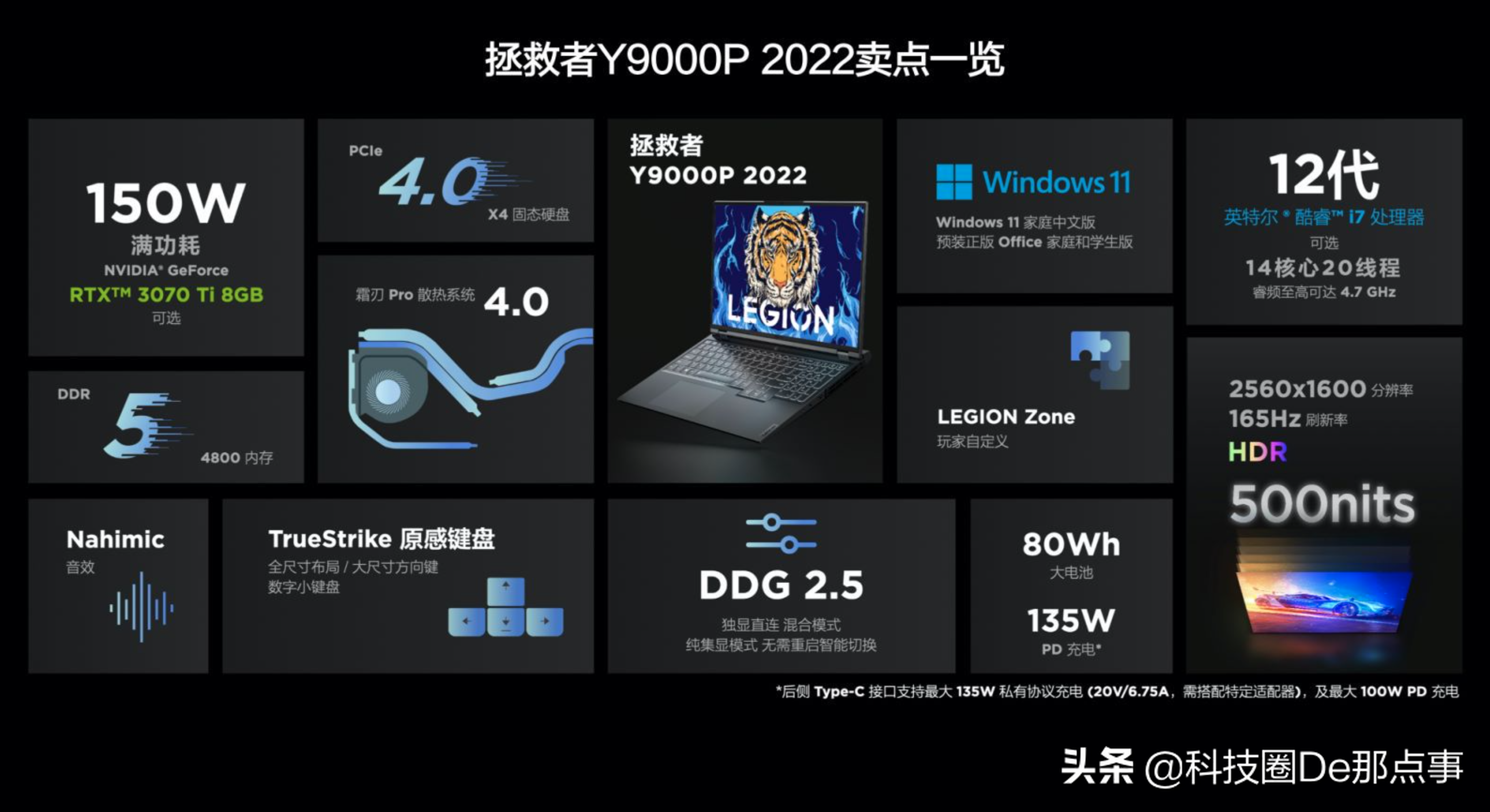 续航方面,拯救者Y9000P2022、Y7000P2022都均搭载了80Wh大容量电池,配合适配的拯救者C135适配器,小体积机身可实现135W功率的高能持续输出,30分钟即可充满80%电量。