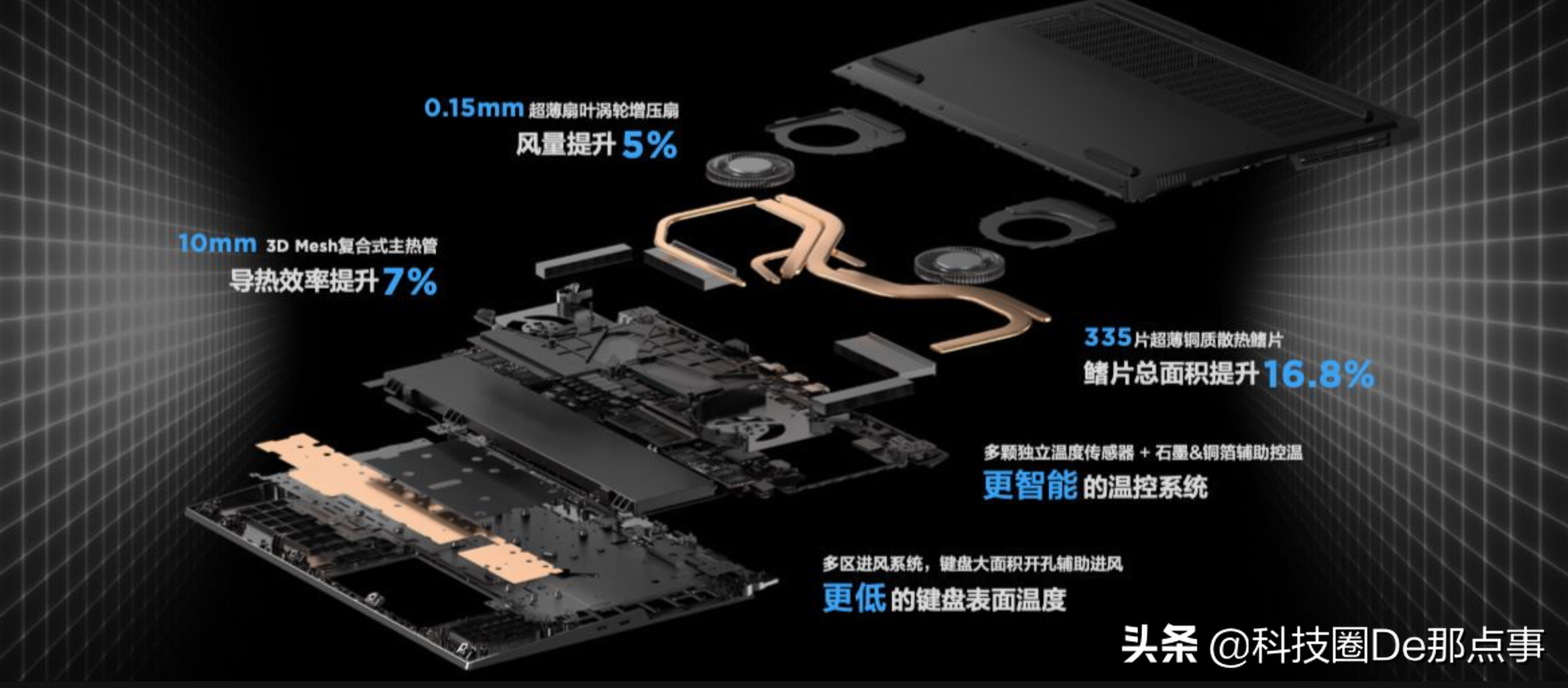 散热方面,采用的0.15mm超薄扇叶涡轮增压风扇,提升了风量和转速,配合超薄铜质散热鳍片,增加散热总面积,让热量无处停留。多颗独立温度传感器精确感应热源,打造更加智能的温控系统。值得一提的是,拯救者Y9000P2022所采用的霜刃Pro散热系统4.0采用了10mm3DMesh复合式主热管,增加热传递效率的同时,精确的触达核心上的热点,使散热效率较上代10mm热管得到进一步的提升。两款新品还内置了全新的设备自定义软件——LegionZone,提供更多可调参数,功耗,超频,风扇转速等自定义选择,可玩性进一步提升。