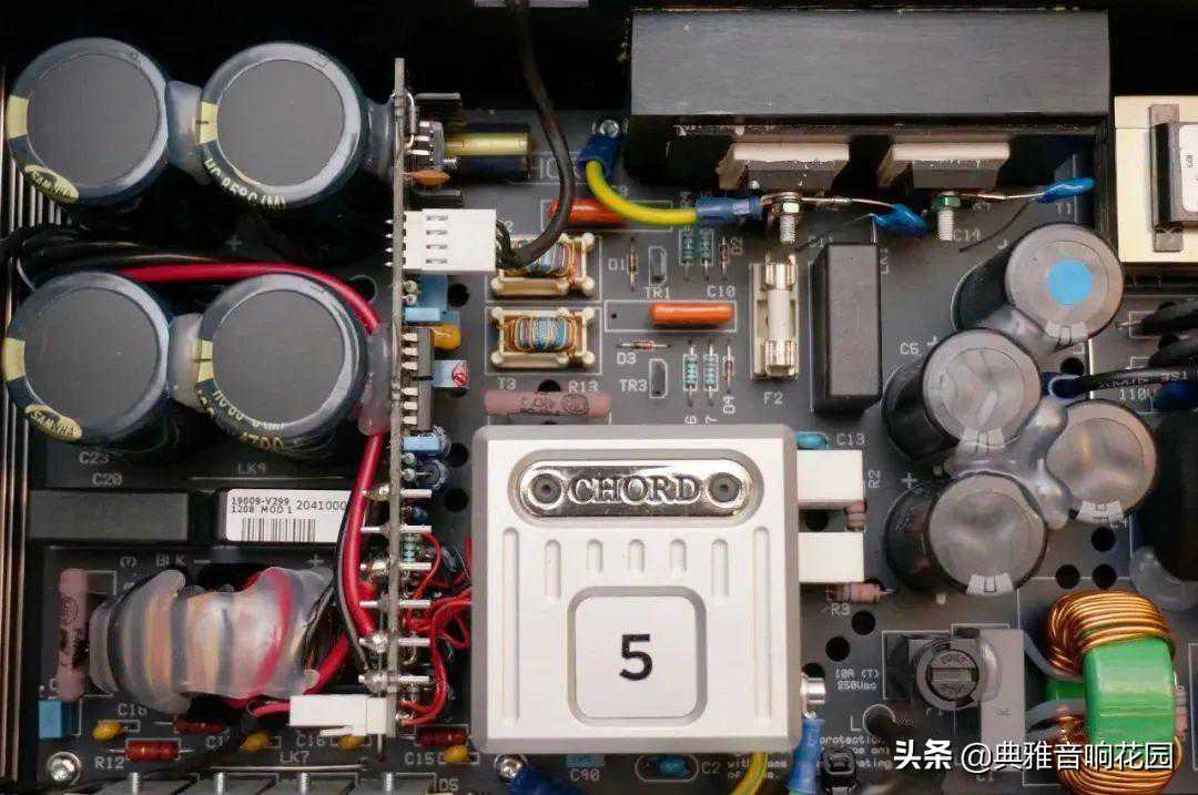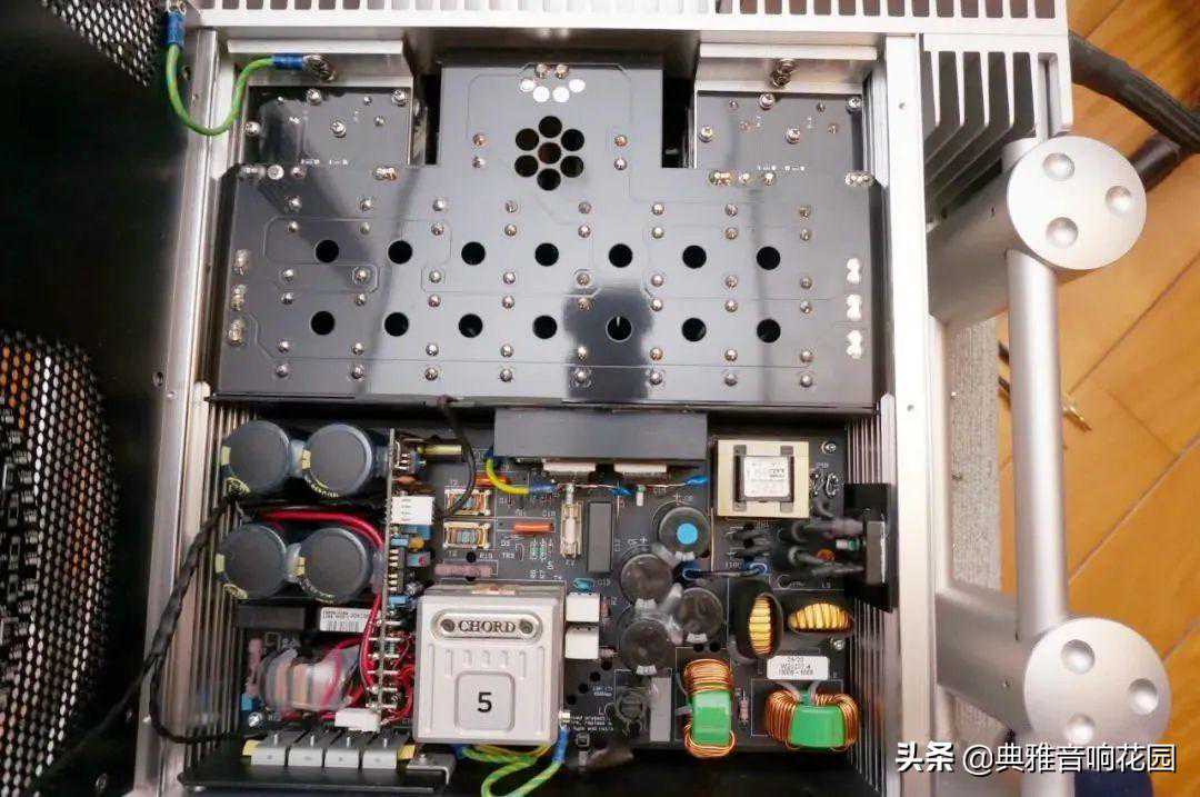 打开顶盖之后,才知道原来左右二侧的侧板也具有散热片的作用,只是没做成散热片形状而已,因为有发热的晶体锁在上面。此外,那个写着5的金属模块也相当热,难怪Chord的扩大机顶盖要设计成镂空,因为整个电源供应线路是需要散热的。再仔细看电源供应那里的滤波电容,发现都以硅胶黏住,连电感上也附上一层硅胶,可见Chord对于机箱内细微的震动都有仔细处理。
