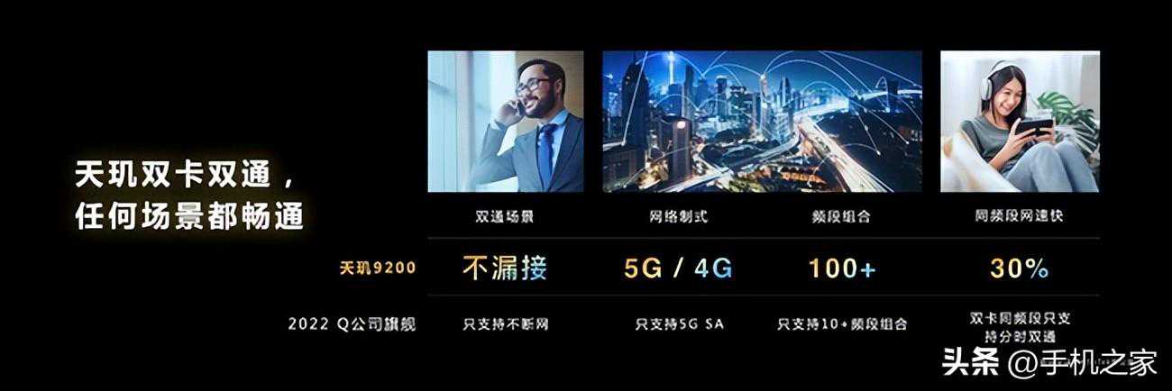 同时,天玑9200集成先进的5G调制解调器,支持高速5G网络连接,结合先进的AI人工智能技术,打造了高铁(网速提升20%)、地库(回网提升20%)、地铁(回网提升20%)、机场(开机找网快30%,全球机场数40+)等场景下的5G智能出行模式,实现找网快、回网快、网速快的智能连网功能。MediaTek特有的UltraSave省电技术也从5G连接延展至Wi-Fi,带来更完整的低功耗通信解决方案。重载场景周边存取优化降低19%,轻载场景电源配置优化降低10%,待机唤醒优化降低13%。作为双卡技术的引领者,天玑9200推出“5G新双通”,支持更多网络制式、100+频段组合,可让同频段网速更快。