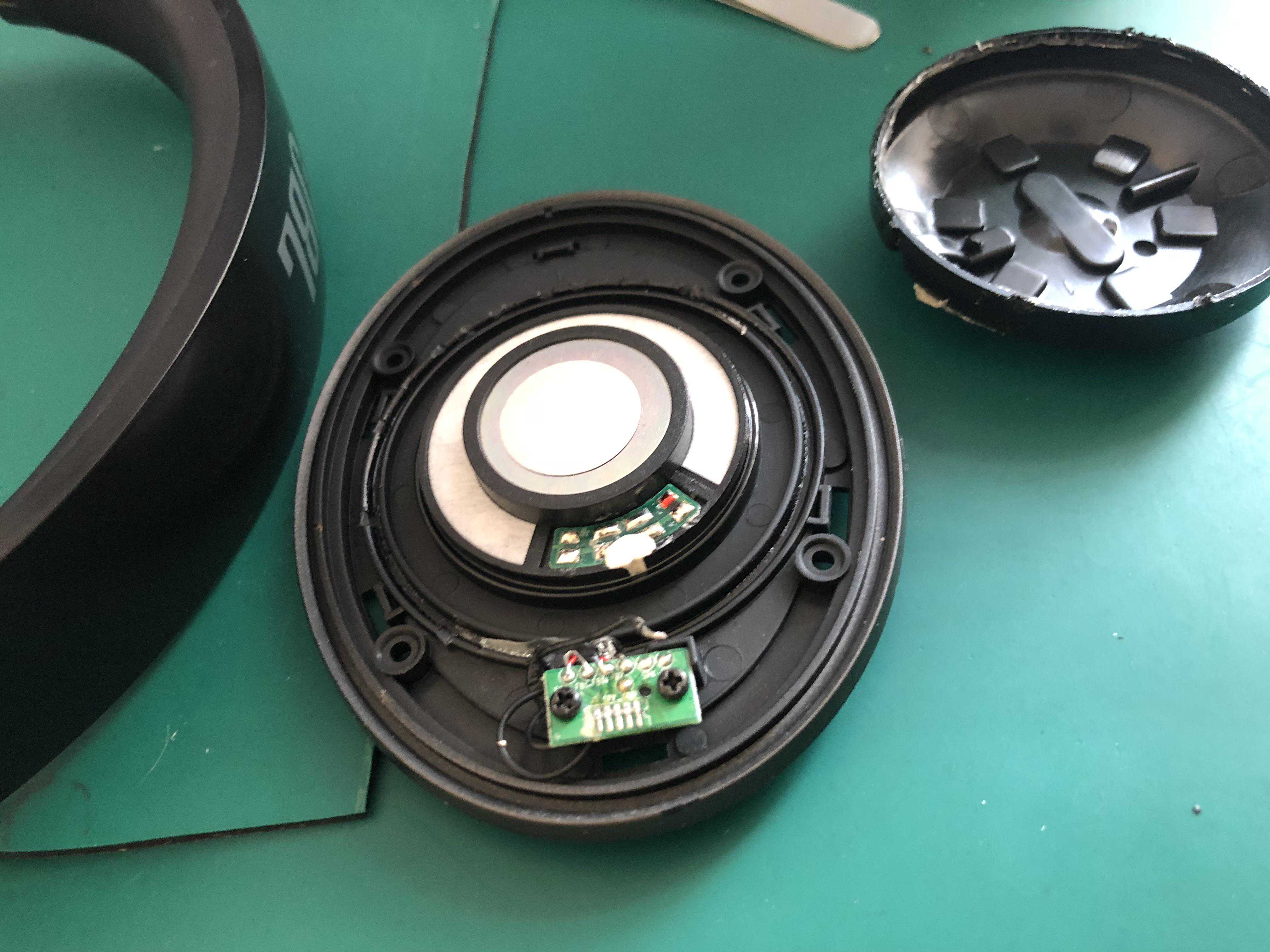 手头这台,听着听着,一边无声了,以为是接触不良,可是怎么带着蹦跶都没有反应,想想这种耳机,带蓝牙和降噪电路,不知道会不会电路故障,于是就拆开先测试喇叭看看