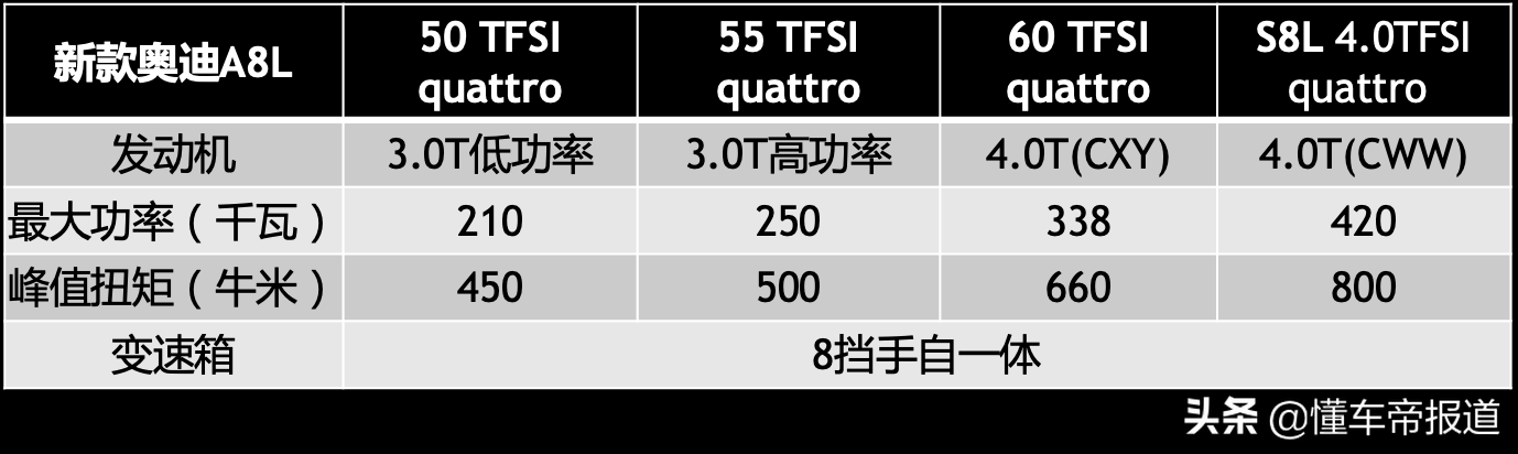 新款奥迪A8L动力配置回顾: