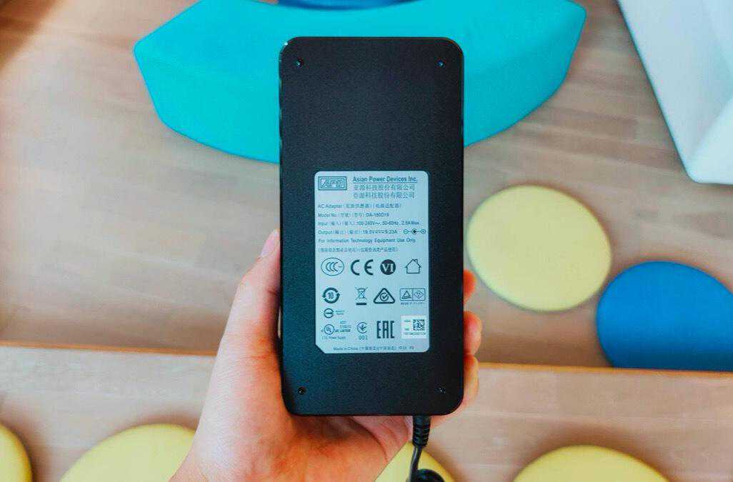 还有一个硕大的电源适配器,电源线总长为3.4m=1.5m+1.9m,这个长度满足日常使用绰绰有余。电源适配器的输出标准是19.5V/9.23A,也就是说输出功率为180w,弱电端附带磁环,由亚源科技提供。下面不得不吐槽下这个电源适配器的体积了,三围尺寸达到了16.5*8.1*2.4cm,这在氮化镓充电器的时代尤为的扎眼,好在投影仪并不是经常需要移动的产品,在一定程度上可以弥补电源体积过大问题。