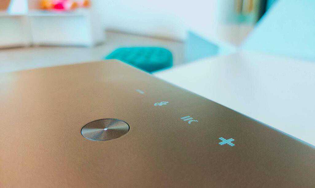 在工艺方面,可以看出PM尽量避免在避免商务投影仪的那种庄重硬派气息,正面下半部分采用了灰色布艺来增加产品的奢华质,同时让其更能融于家居环境。整个机身被一条腰线贯穿,产品的立体感瞬间提升不少。