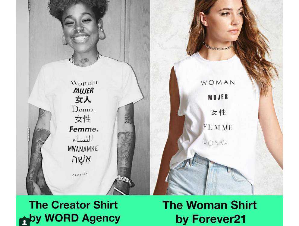 早前因“条纹事件”被Gucci起诉的快时尚品牌Forever21日前又再次涉嫌抄袭。洛杉矶一间名为“Word”的品牌代理设计了一款为美国计划生育联盟筹款T恤,这件白底黑字的T恤上将“女性”一词翻译成9种不同的语言,希望表达任何种族、文化、宗教和经济背景的女性都应享有同等的医疗保障,售价为每件25美元。不过,该品牌代理日前在Instagram上发布了一张对比图,指责Forever21公然抄袭该T恤创意并在店内发售的行为。