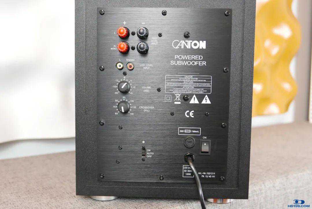 再来看下这个有源低音炮,配备了一个8寸的铝制低音单元,采用开孔设计,倒相孔位于音箱正面。低音炮的炮板也给出了相对丰富的设置,比如电源模式(关、开和自动),建议放在自动,当接收信号时,低音炮会自动开启。另外还有两组高电平输入端子,不过现在的AVR都有低音炮输出,使用炮线来连接。中间有两组旋钮,一个可以调节低音炮的音量,一个可以做65HZ—150HZ的分频,将它开到最大可以使用AVR来做低频管理。