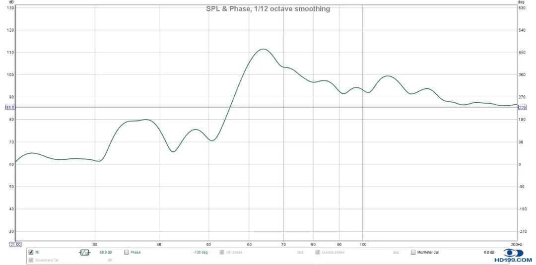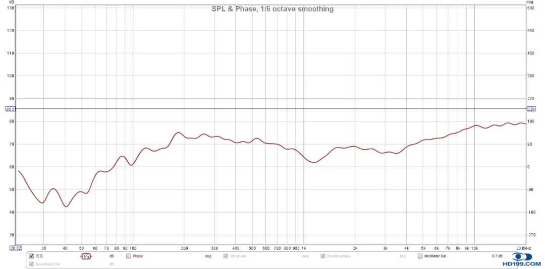 用REW大致测了一下频响曲线,可以看到这套卫星箱,它是在高频和低频有上升,而在中频段有一些压制,因此如果你追求对白力度,可以稍微增加中置的增益。再看下低音炮的曲线,频谱表现还是很不错的。