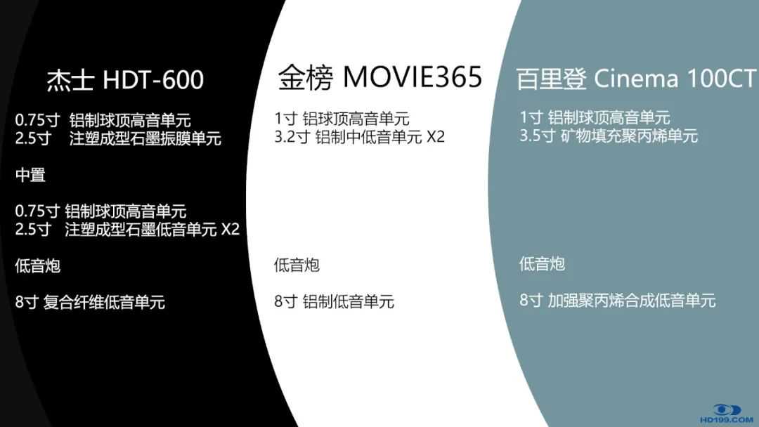 提到竞品,论坛上经常会把将金榜、杰士、百里登的卫星箱放在一起比较。MOVIE365的五只音箱全部采用三个单元的哑铃式设计,也就是一个高音加两个中低音。CINEMA-100CT只有两个单元,而HDT-600只有中置音箱是采用的三个单元。仅从单元数量上看,MOVIE365的优势很突出。