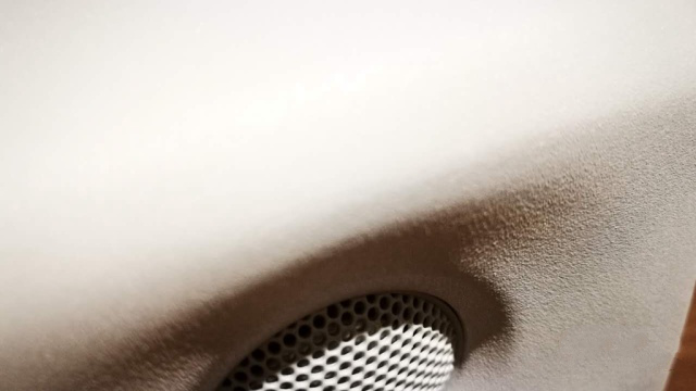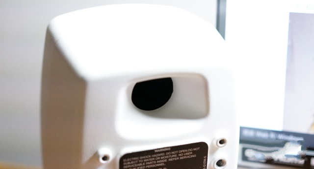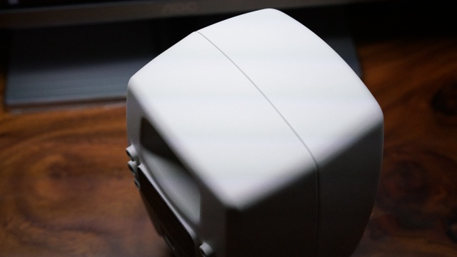 光线缘故,网罩变色了,其实是全白的。按照官网的说法,铝制外壳比木质箱体更加坚固,也能够减少共振。不过圆形箱体的设计倒是能够降低尖锐边角所带来的衍射,在现场试听的过程中能够感受到声音的圆润。相比家中安静的测试环境下,应该会表现得更好。