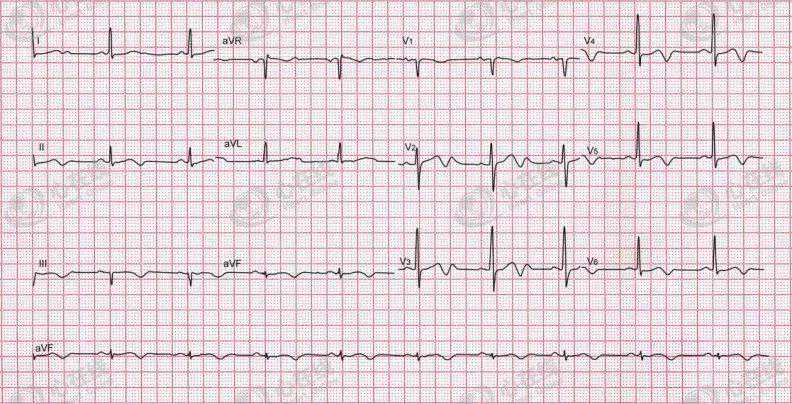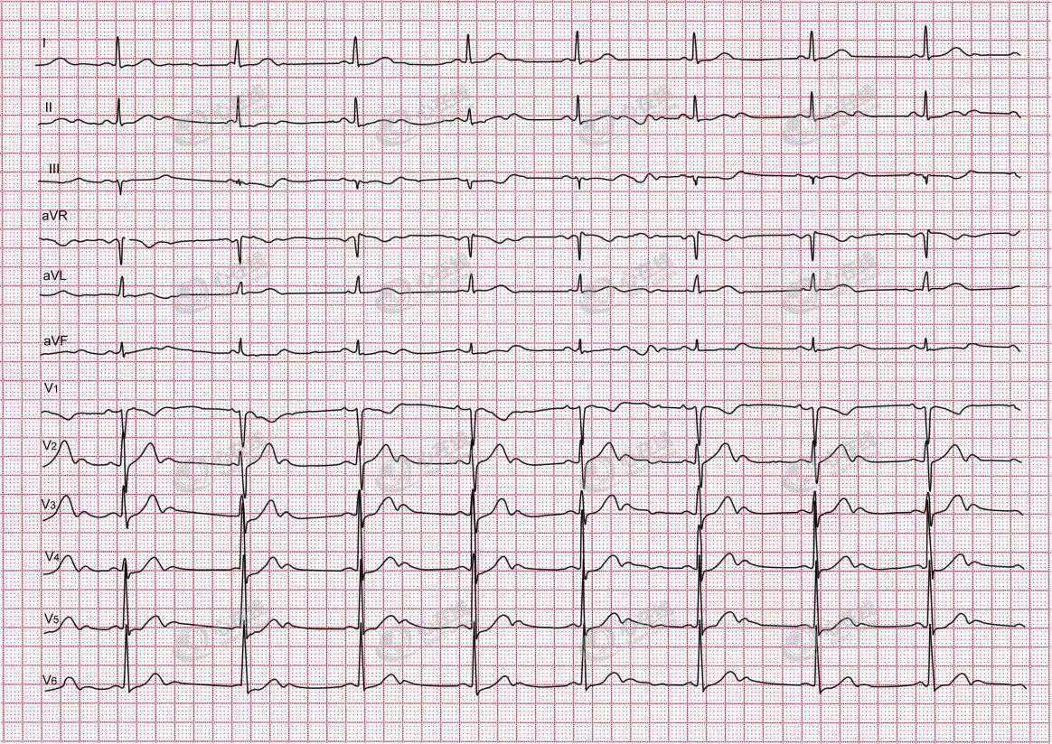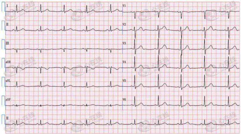 一天傍晚,一位50岁广场舞大妈,做饭后用力拔掉墙上的插销,立刻感觉到前胸及后背部剧烈疼痛,立即拨打急救电话,送至医院。测血压140/90mmHg。心电图提示II、III、aVF、V2~V6导联T波呈三相波,QTc465ms(图1)。血白细胞总数18.06×109/L,肌钙蛋白、钾、钠、钙均正常。