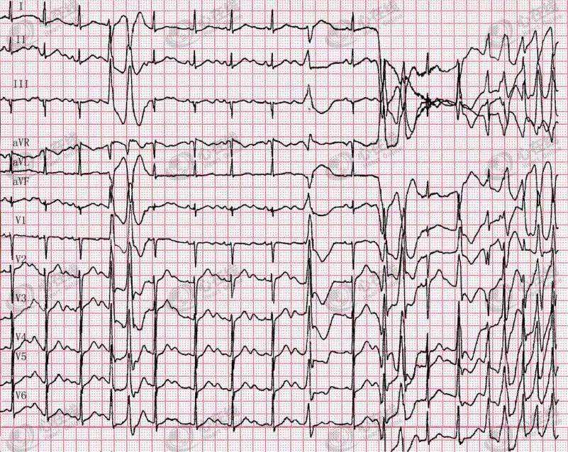 第2天,患者突发意识丧失,心电图提示尖端扭转性室性心动过速(图4),当时血钾水平正常,给予心肺复苏及补钾、补镁等治疗,停用莫西沙星。