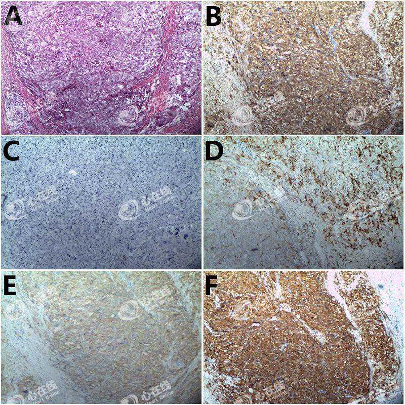 出院后患者不甘心,再次就诊于泌尿外科,入院切除肾上腺结节。病理提示嗜铬细胞瘤,S-100蛋白阳性;免疫组化显示肿瘤表达Ki-67(index2%)、NeuN、Syn、CgA(图8)。
