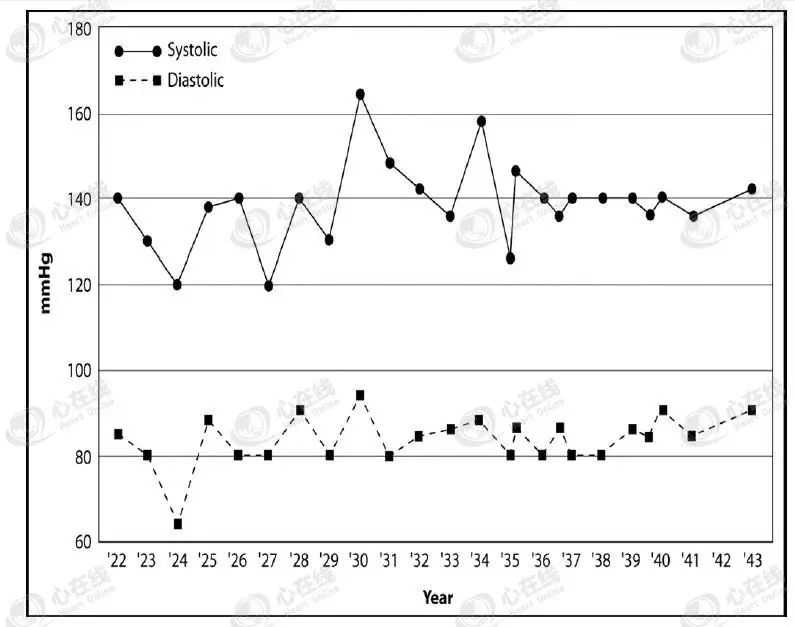 美国第三十四任总统艾森豪威尔,1955年心脏病发作,并于14年后死于缺血性心肌病。尸检结果显示左侧肾上腺1.5cm嗜铬细胞瘤。从1930年至去世,他的血压都记录在册(图9),但并没有发现嗜铬细胞瘤的踪迹。在他生前的最后阶段,饱受缺血性心肌病折磨,但仍记录到血压升高的峰值。我们分析这个隐藏在总统身上的杀手“嗜铬细胞瘤”,不仅引起了总统血压的波动,同时还导致缺血性心肌病病情加重,进而导致死亡。