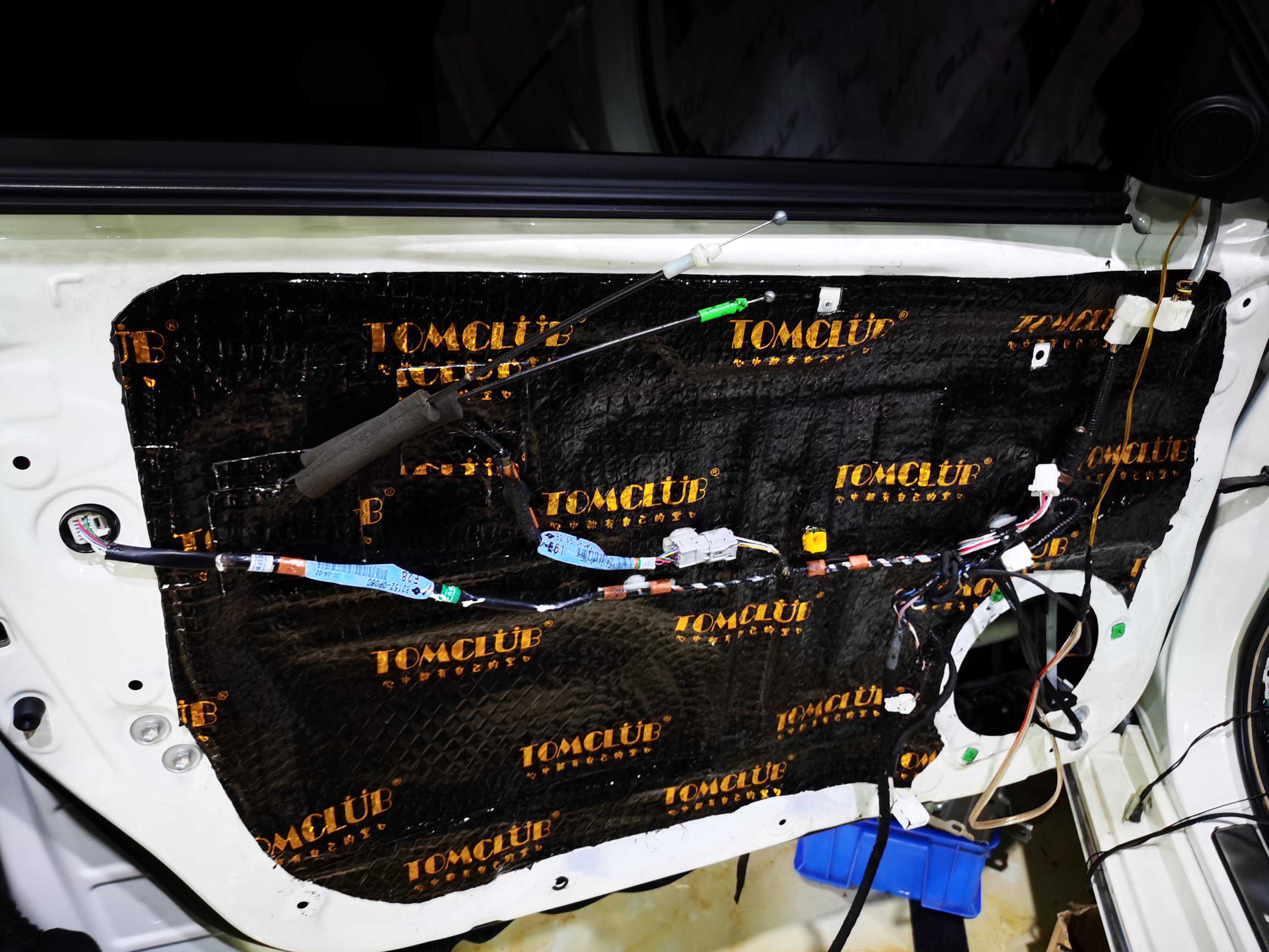 首先使用TOMCLUB堂口隔音材料对汽车门板做隔音处理,让门板形成一个密封的箱体,可以让喇叭更好的发挥,又可以抑制钣金较薄所产生的共振与风噪等问题。