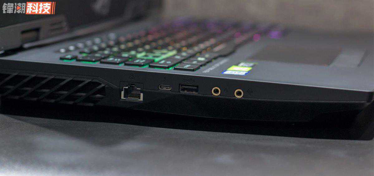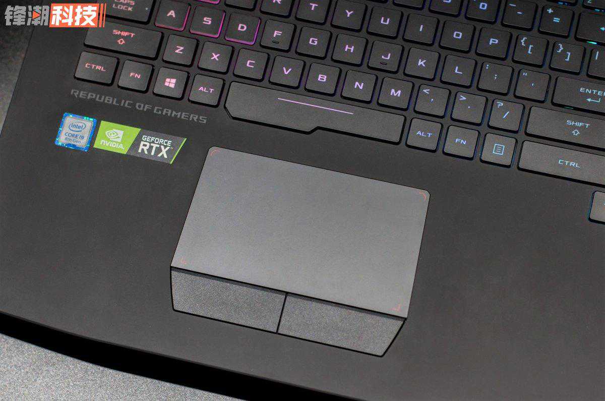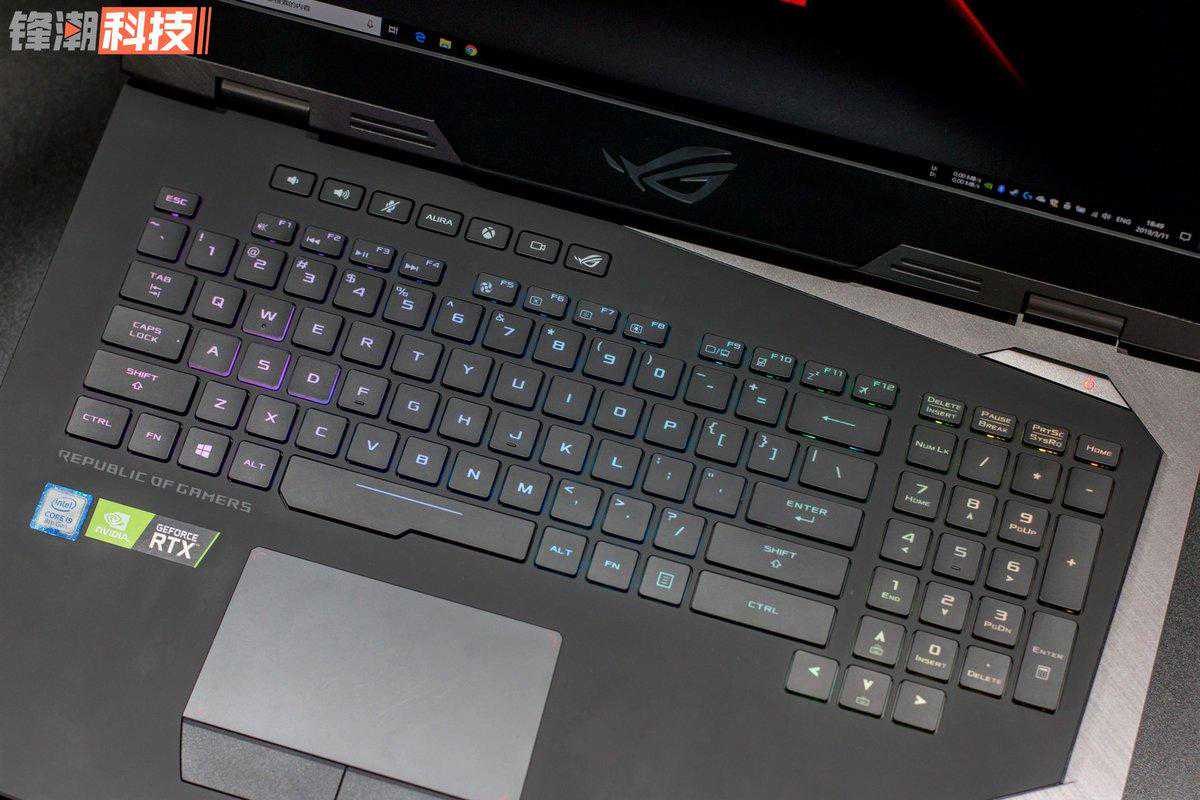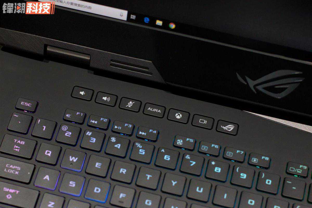C面的虽然为塑料材质,但大部分的面积都添加了类肤质图层,手感非常好,缺点就是很容易沾染指纹。键盘带有RGB灯效,玩家可以在AURA灯效软件中修改呈现的效果。键程有2.5mm,并且空格键、方向键均有特殊处理,符合游戏本的操作逻辑。