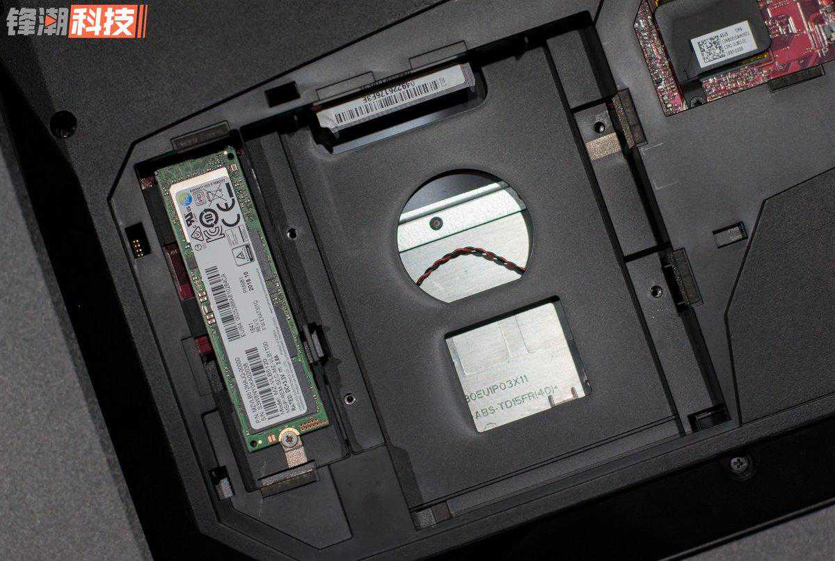 打开快拆板后,可以对硬盘和内存进行维护。从左到右分别硬盘接口,2.5英寸SATA硬盘接口,PCH芯片组,SODIMM内存插糟×2以及硬盘接口×2。其中顶配版的接口已被占满,用户可以扩展一块SATA硬盘以及两根内存,最大可达64GB。