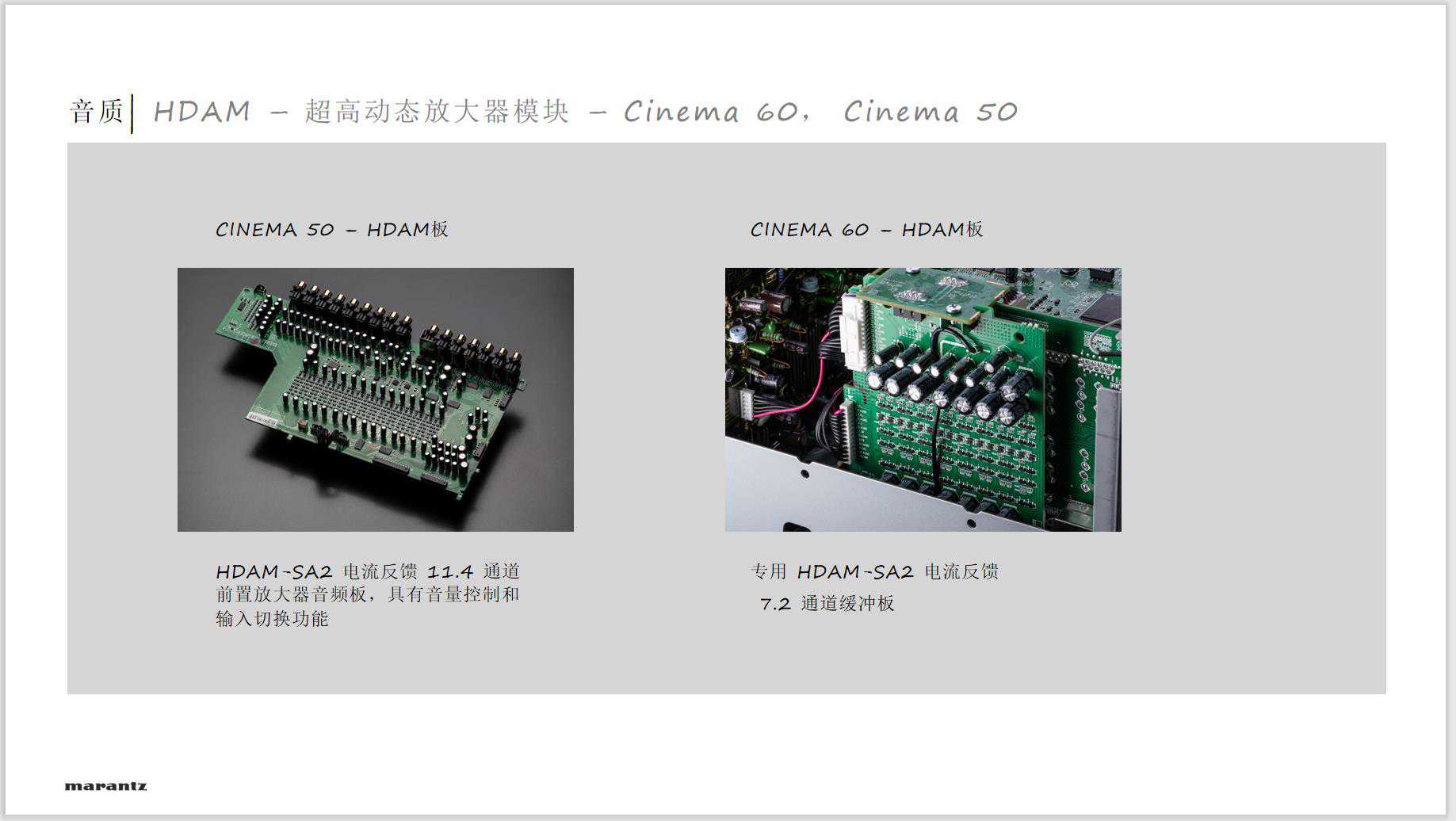 Cinema系列和相对于SR系列的核心区别还在放大电路上的改进,也就是马兰士核心HDAM放大模块的进化。