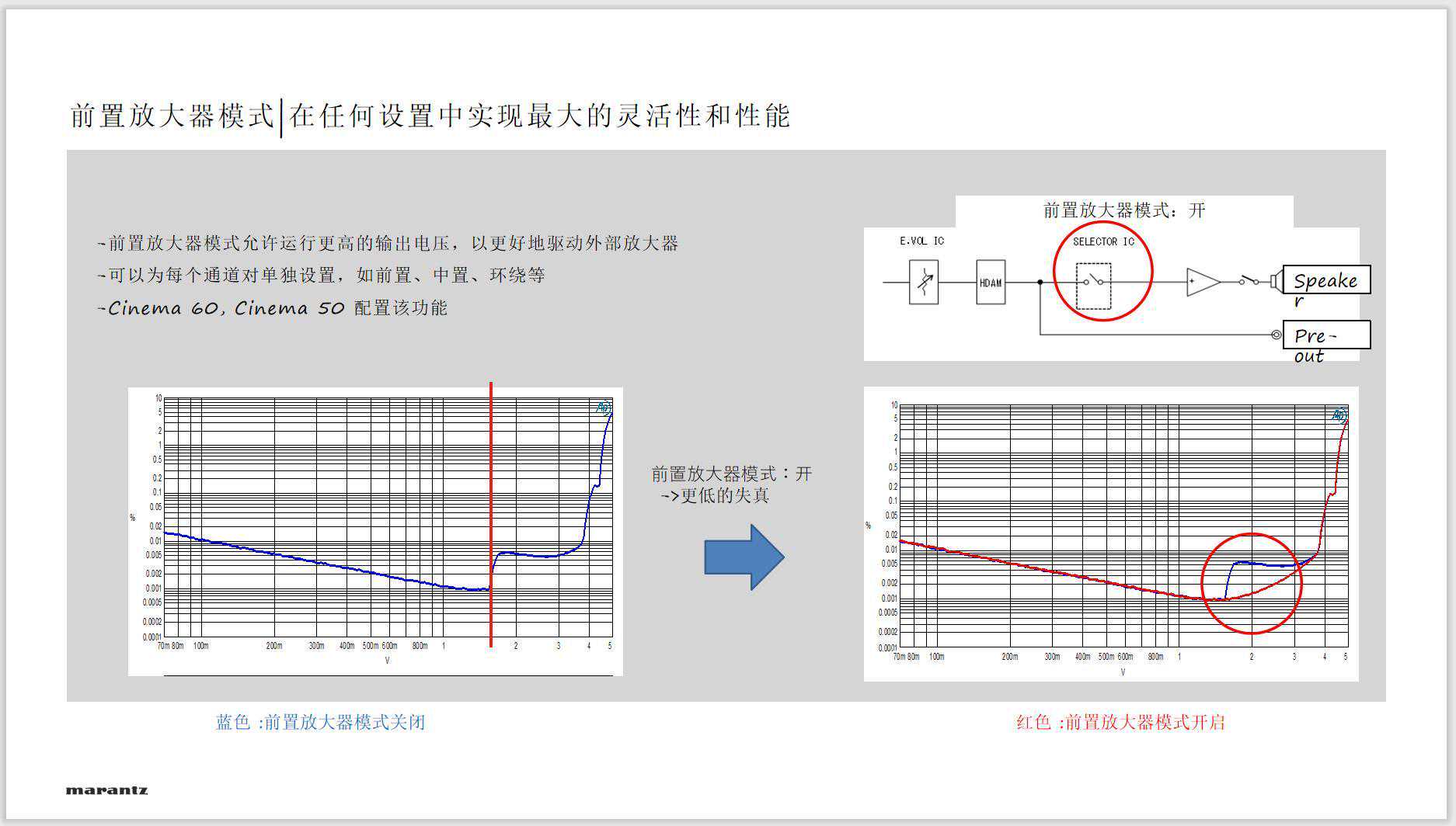 官方也给出了纯前级模式下的性能区别描述。