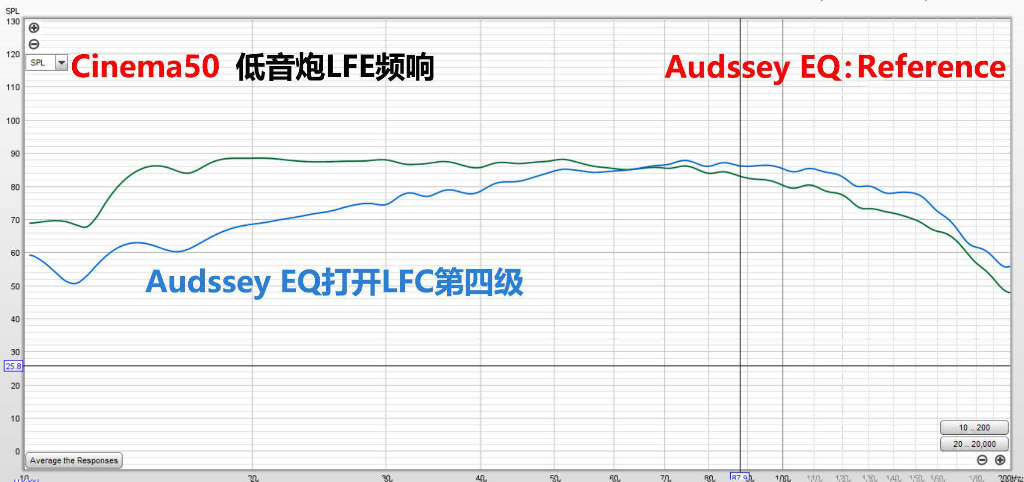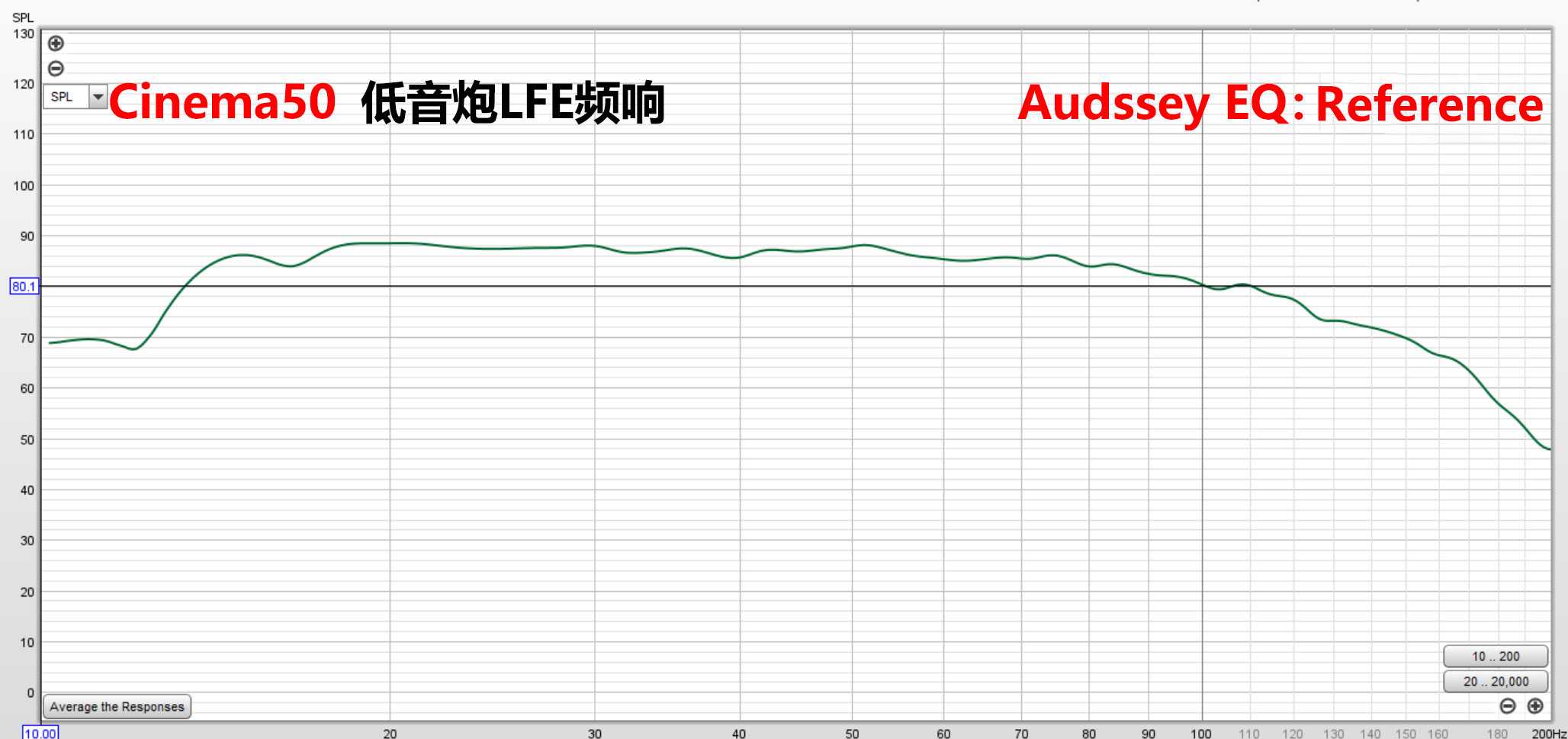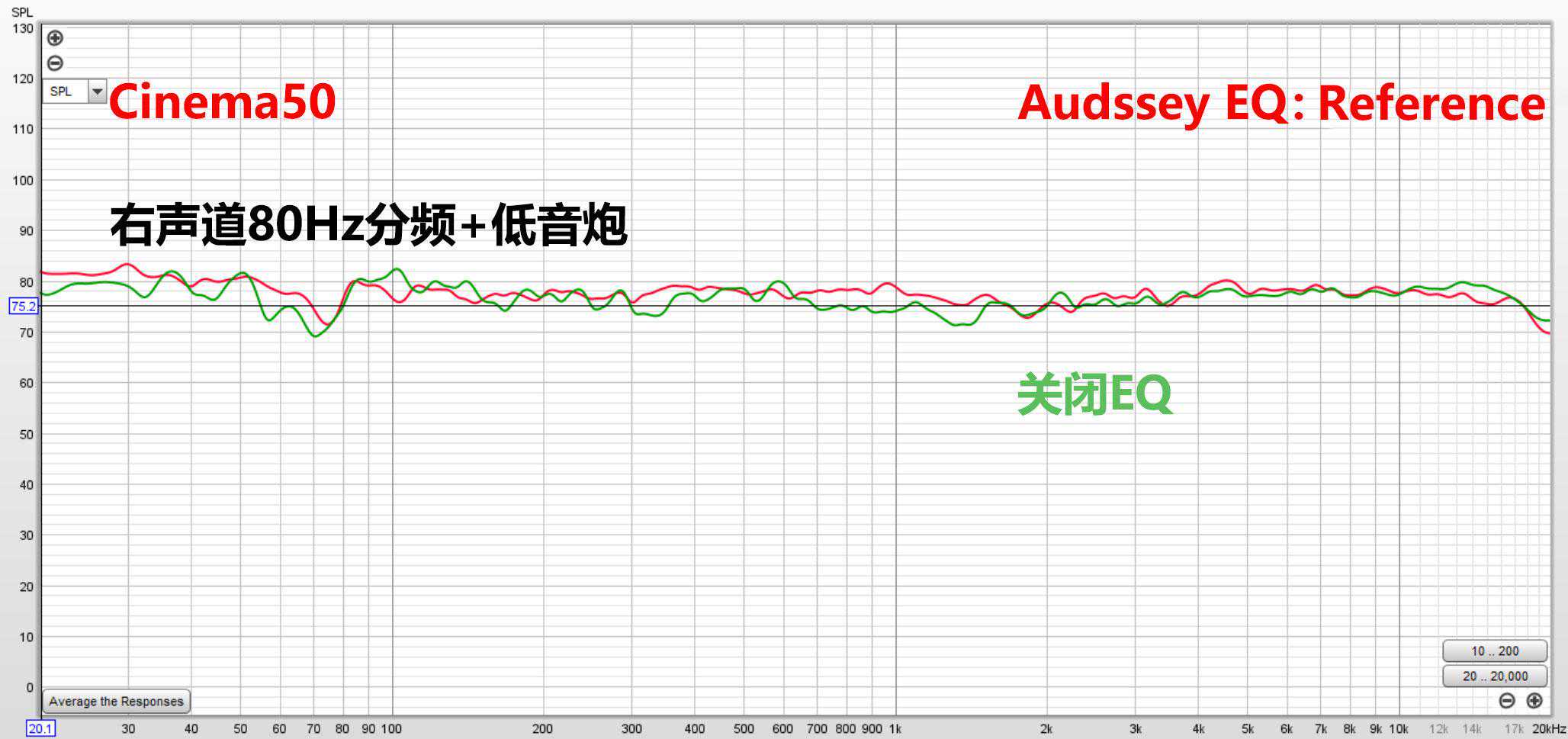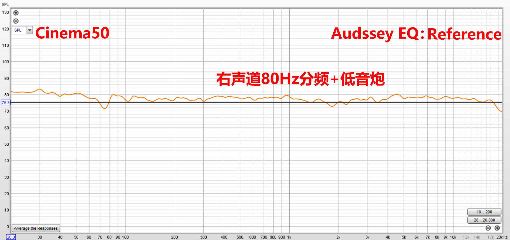 上图主箱还是设到80HZ分频,右声道加低音炮打开AudysseyEQ参考模式的全频表现。
