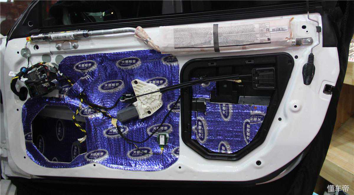 原车钣金是没有任何的隔音设备,无奈共振、风噪较大,粤声改装师傅进行了第一层大能隔音,条状块状贴法,更有效的减少噪音。