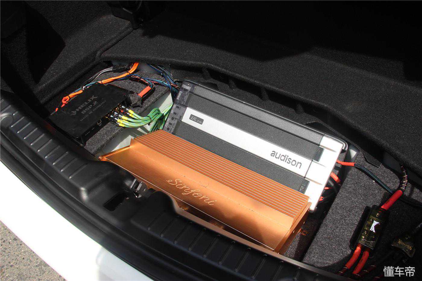 后尾箱左边是德国处理器,让音响系统的调试更加精准快捷,打造极致的聆听体验;右边意大利功放(金色)和意大利功放装上,使音源更纯净自然。