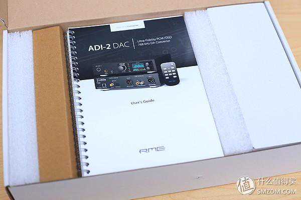 打开盒子,左侧两块泡沫塑料夹着dac本体,上面是说明书,右侧的白色瓦楞纸盒子里是配件。