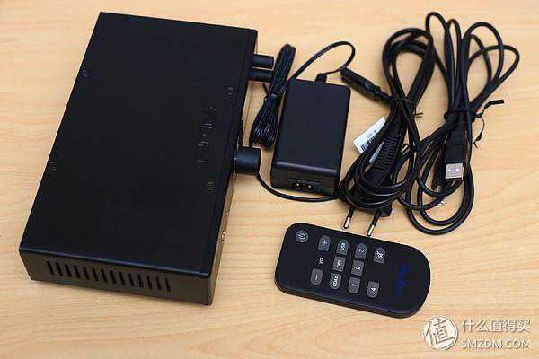 配件一如既往的单调简单,一台主机,一个变压器,一根电源线,一根usb线,比pro少了个输入输出辫子,多了个遥控器。