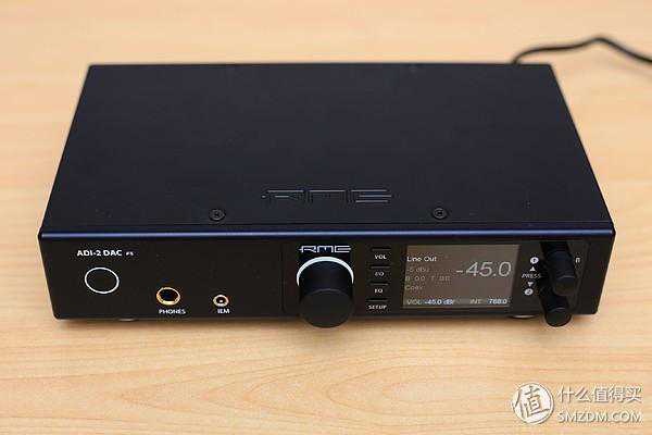 开机以后,电源按钮的指示灯改为白色,主旋钮灯和显示屏亮起。屏幕分辨率不错,观感比较细腻。这机器的参数调整方式比较独特,靠按动那四个功能键进入相应的菜单,然后按动和转动那两个副旋钮去调整。主旋钮主要用于调整音量。rme的音量调整幅度跟你拧的速度有关,如果以很慢的速度来转,就会以0.5db为步长来调整,而如果旋转速度快,步长也会随之加大,手感极好。