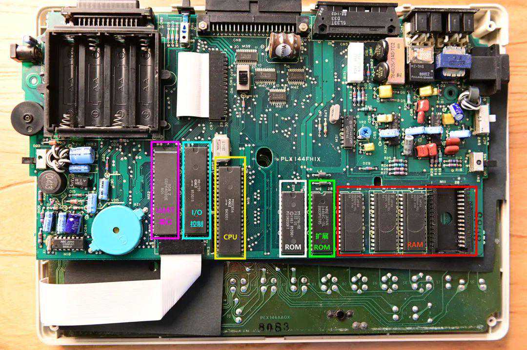 白色框内的芯片是SHARPLH535618的ROM芯片,容量32KB。芯片上还印着“©1983MICROSOFT”的字样,不用想,这个就是储存了整个系统的ROM芯片,当然也包含了招牌的MICROSOFTBASIC。如果要自己修改做自定义ROM的话,27C256芯片可以替换这个ROM芯片。