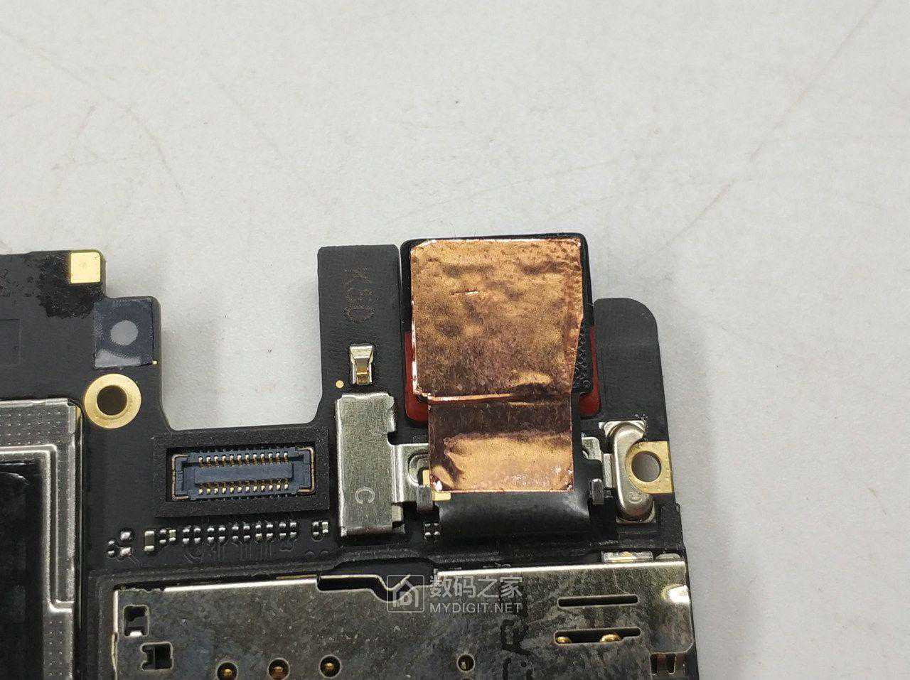 新的大块金属散热片,垫在主板下面辅助散热,5G、反向无线充电等技术的发热不可小觑。